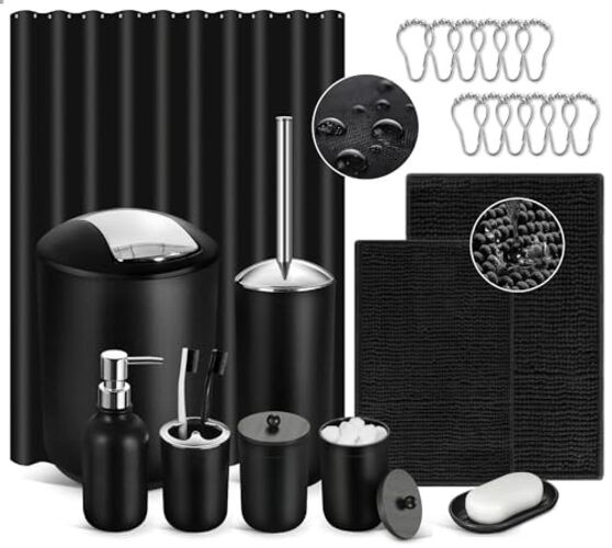 Black Bathroom 7Pcs Bathroom Set Shower Curtain 2Pcs Rugs Black silver