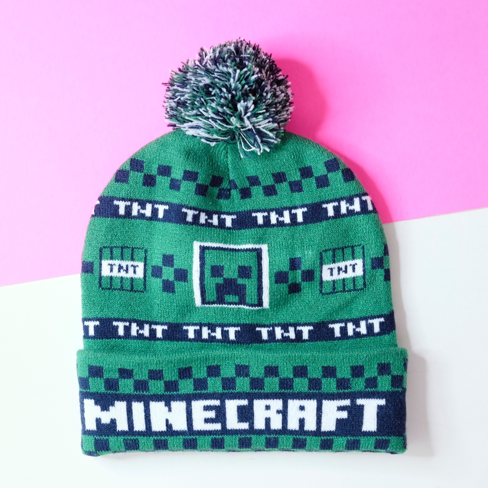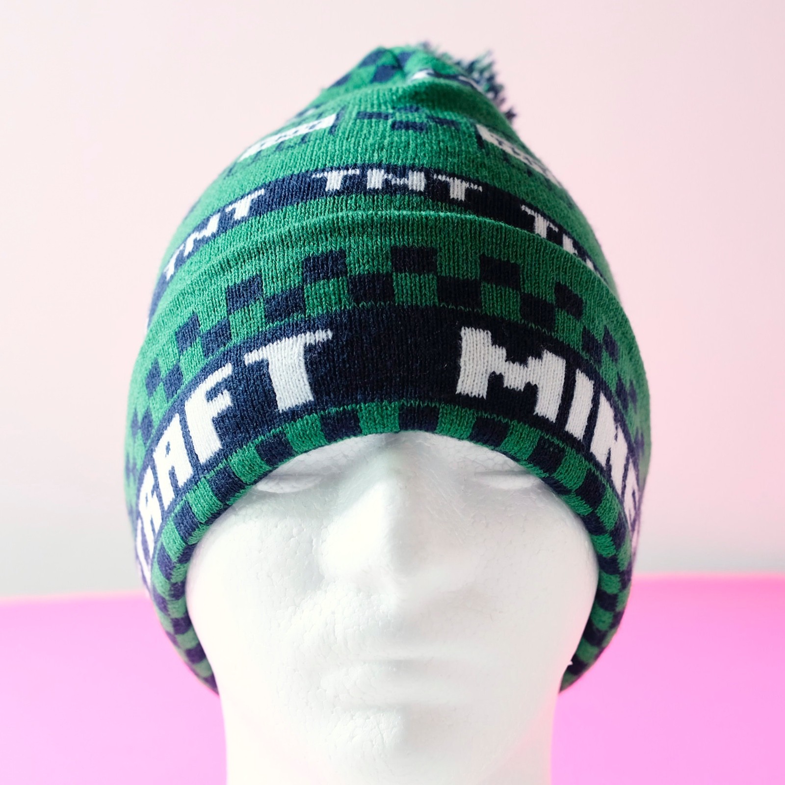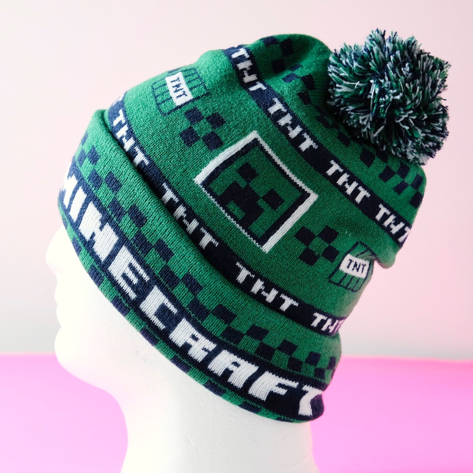 Minecraft Creeper Beanie TNT Green Cuffed Checker Youth Winter Knit Hat with Pom