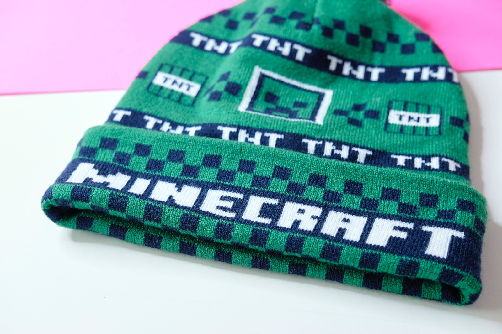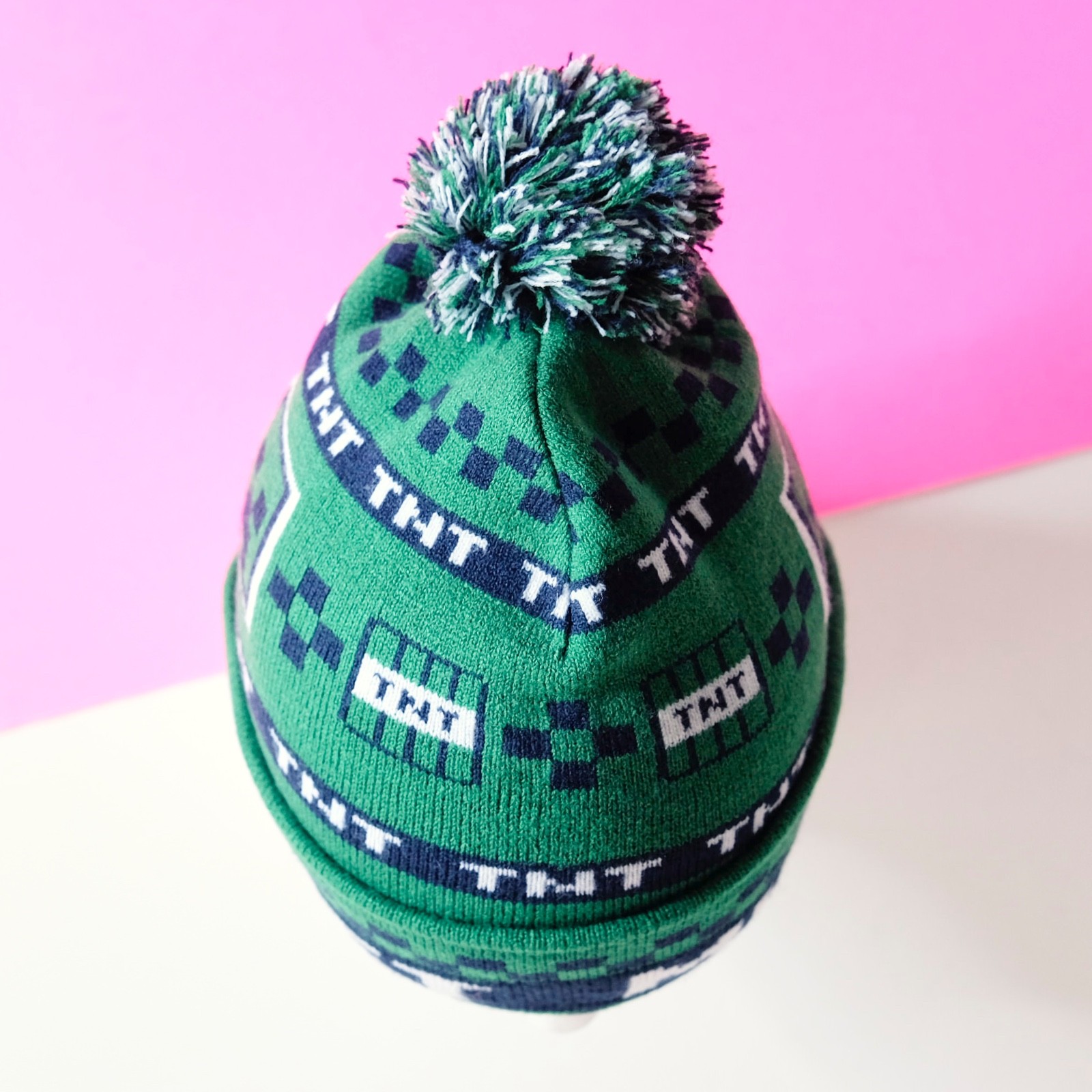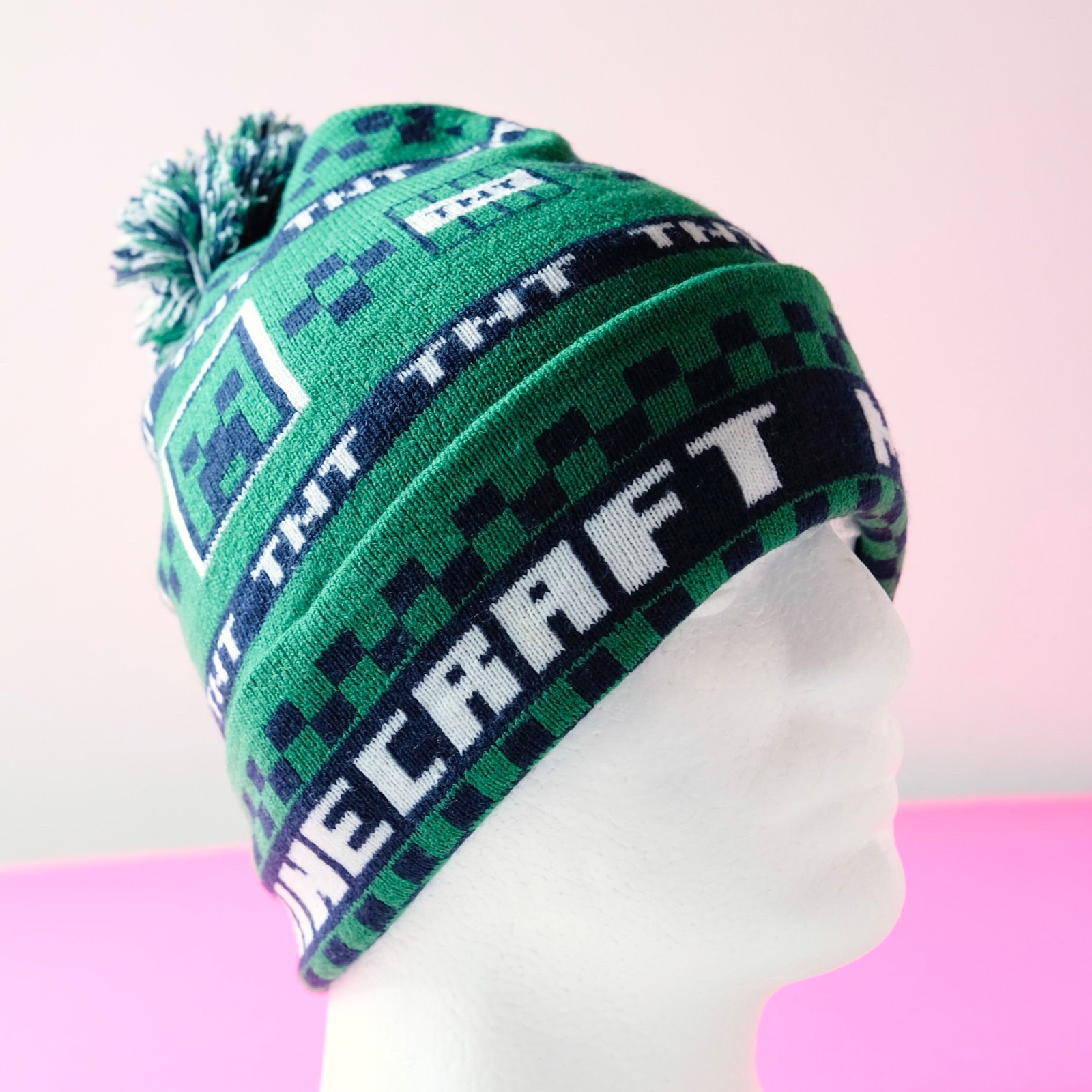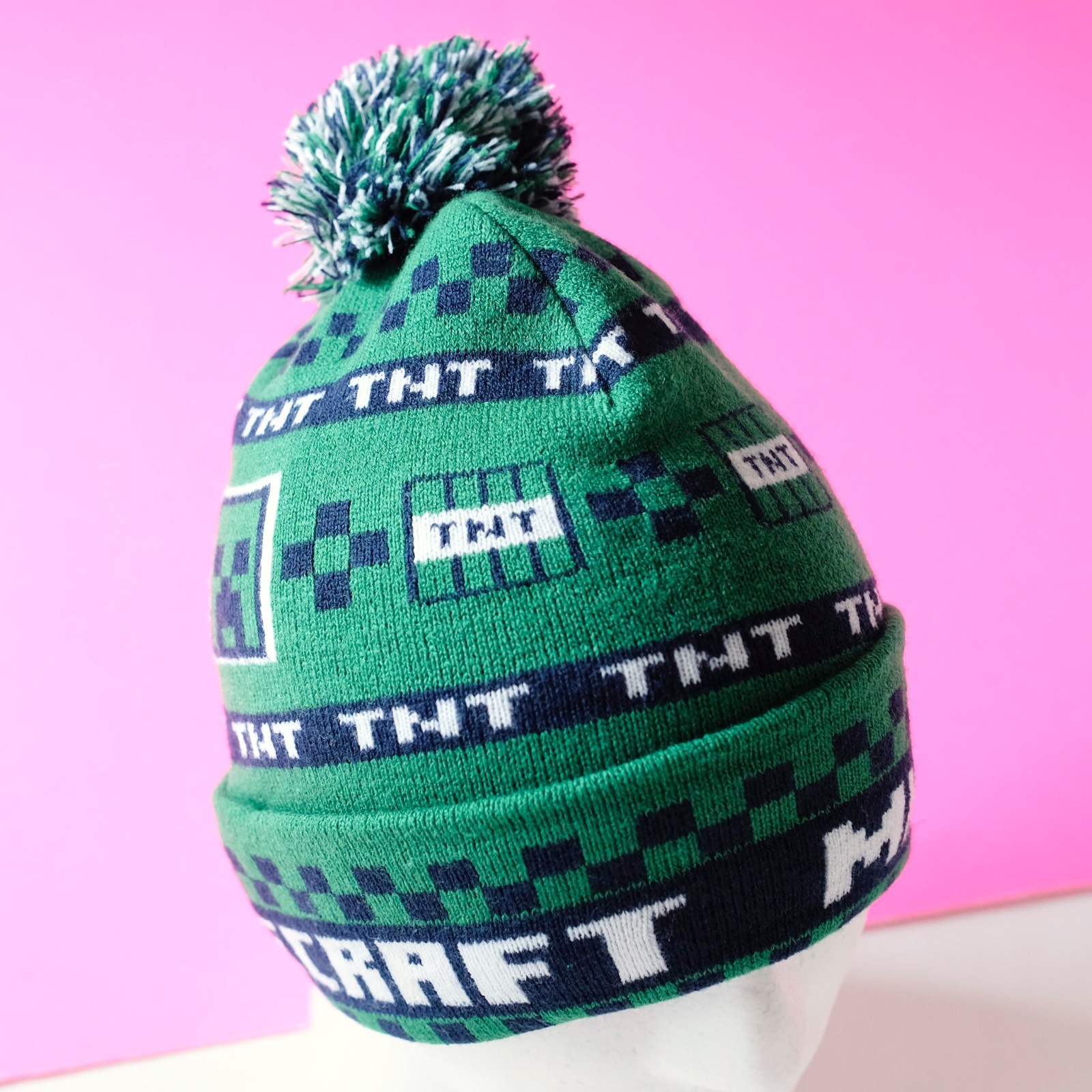 Minecraft Creeper Beanie TNT Green Cuffed Checker Youth Winter Knit Hat with Pom