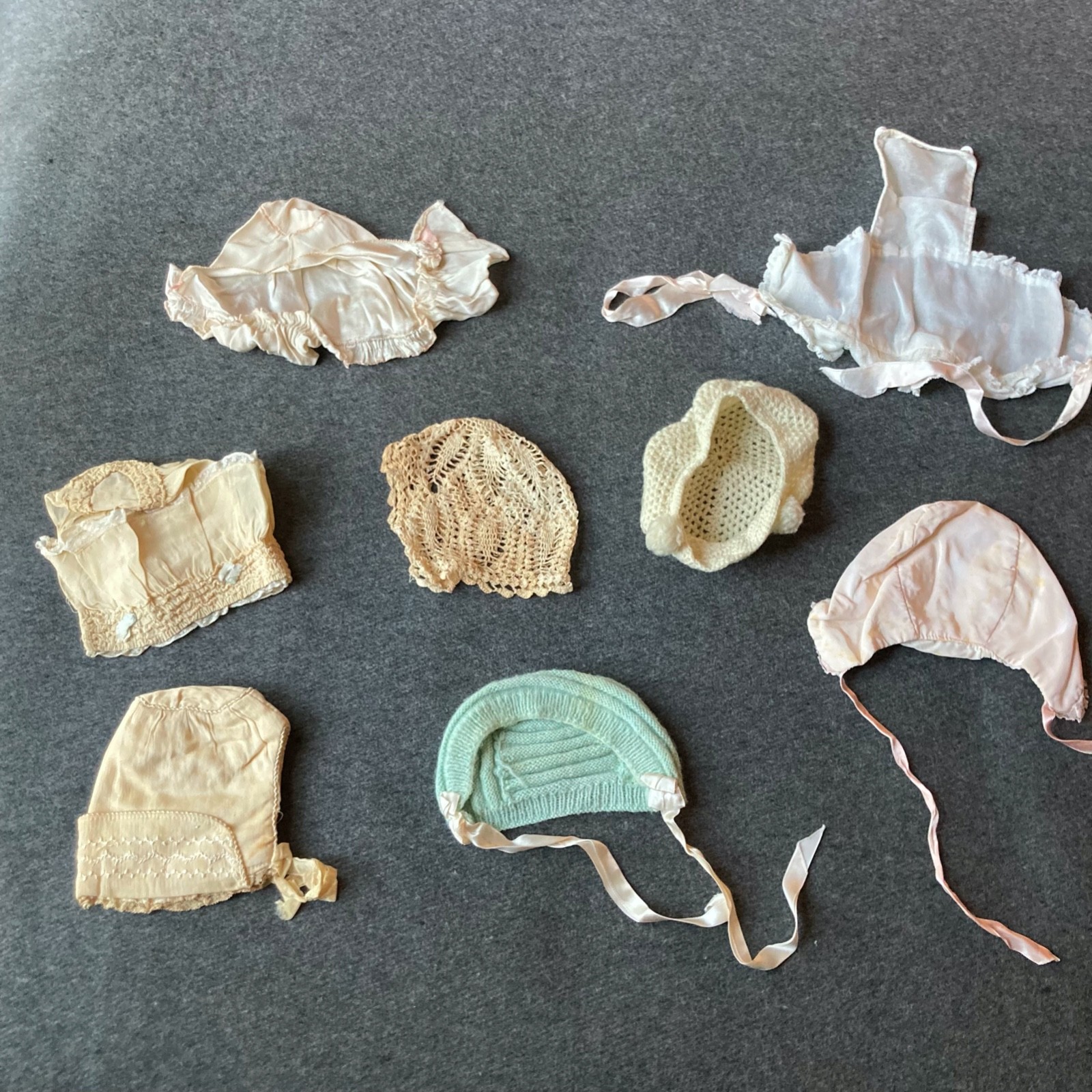 как выглядит Handmade Doll Baby Bonnets Hat Vtg Lot Of 8 Various Colors Used Mixed Materials фото