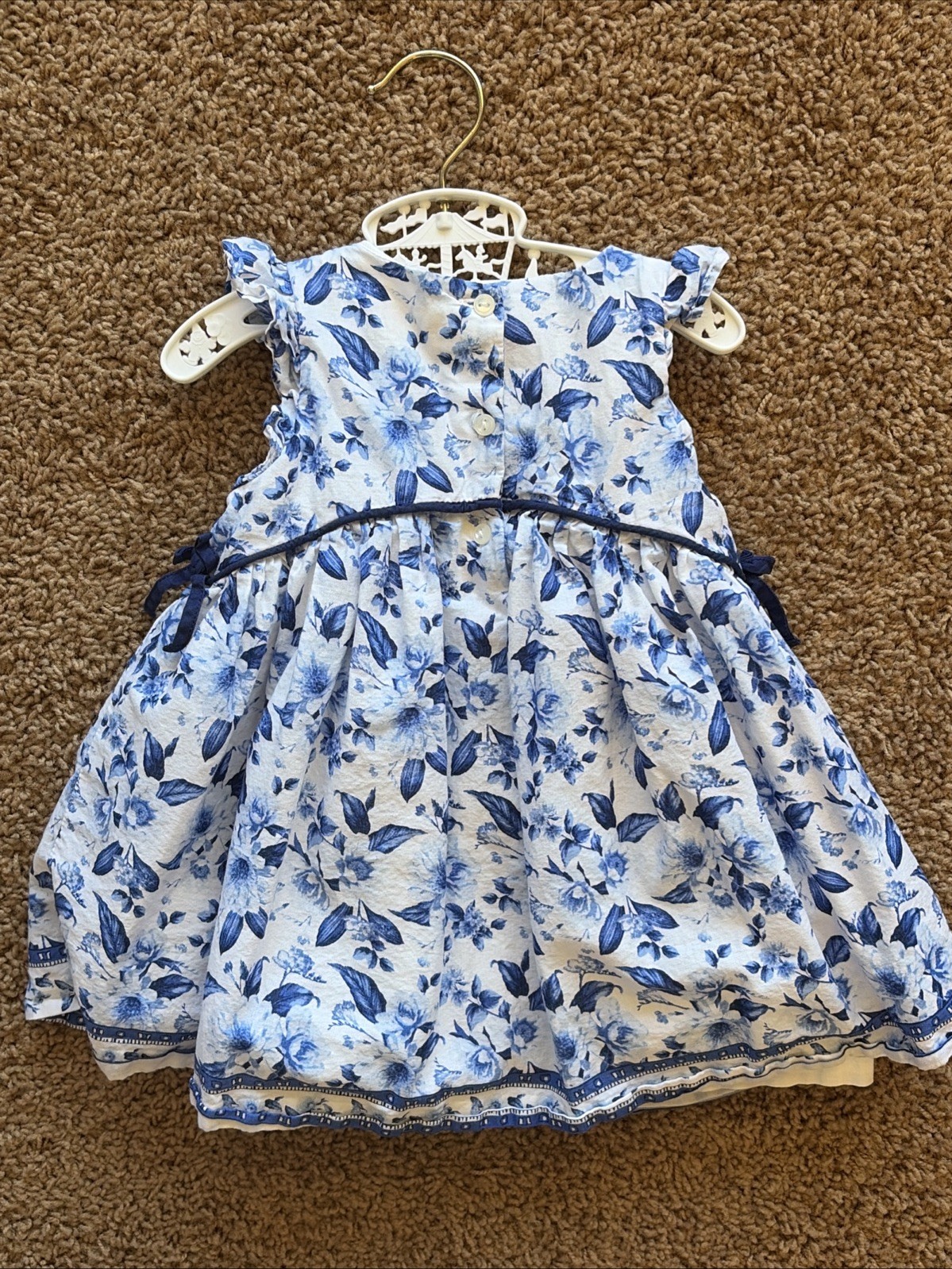 Janie Jack White Blue Allover Floral Flower Ruffle Bow Easter Dress 6-12M
