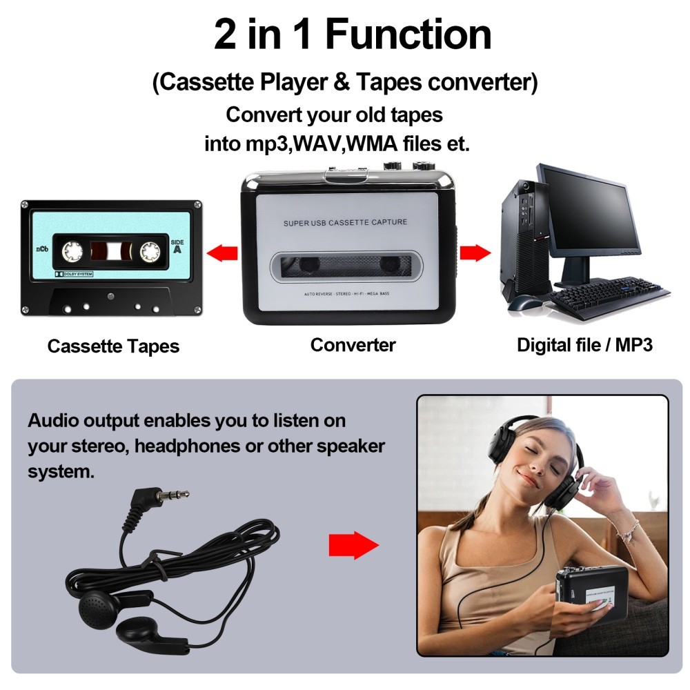 Cassette Player - Portable Converter Recorder Convert Tapes to Digital MP3 USB