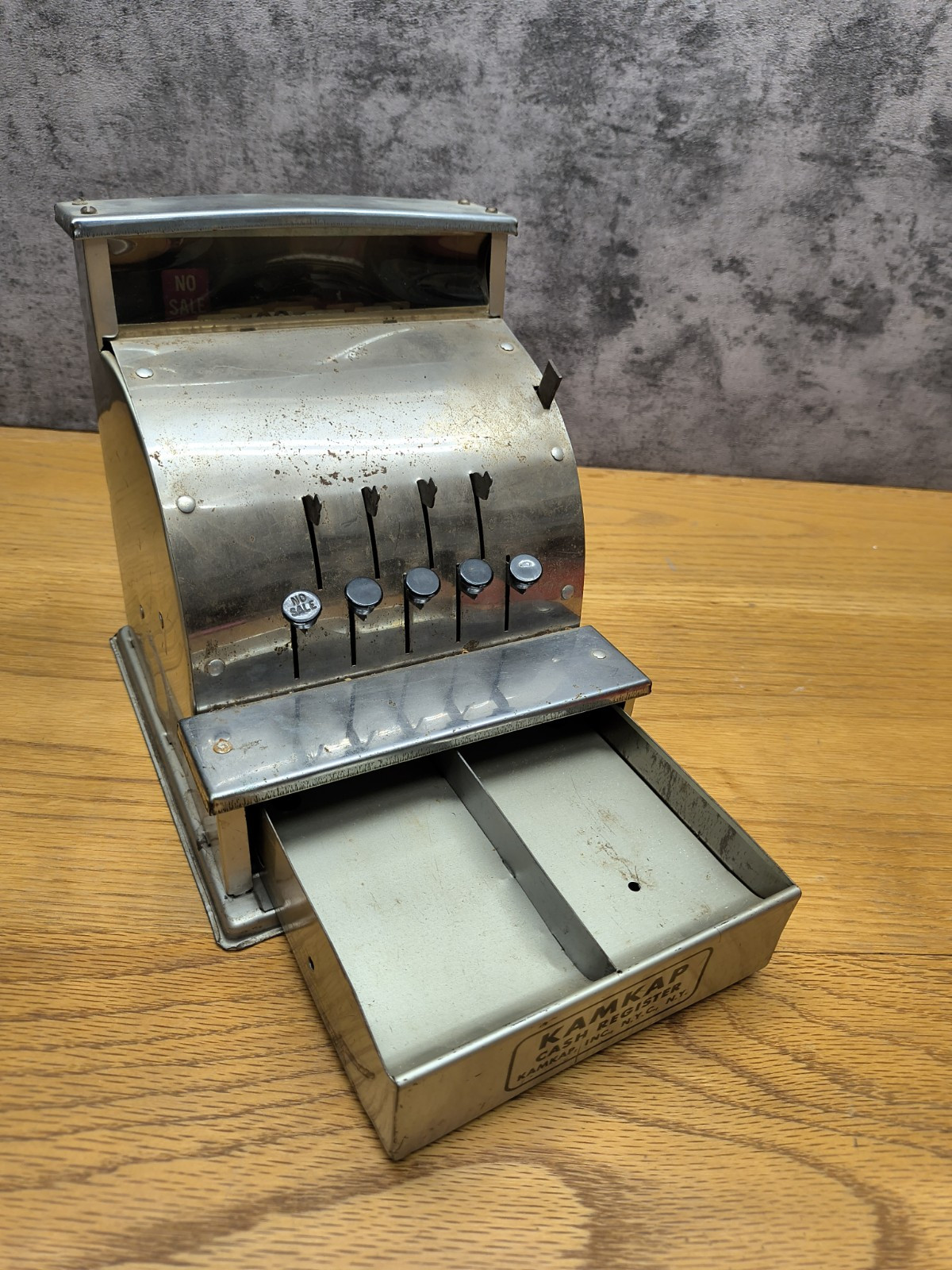 1950's KAMKAP Metal Junior Merchant Toy Cash Register-Drawer Hangs Up