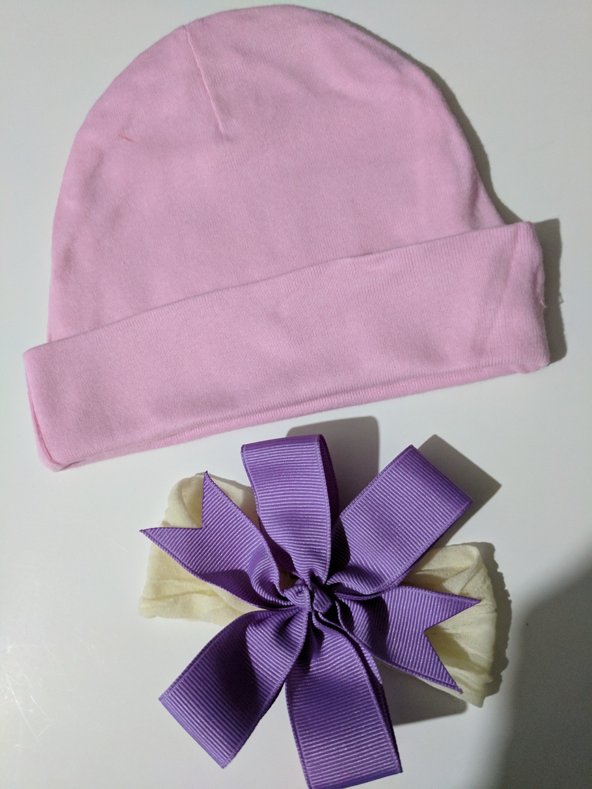 Baby girl beanie pink hat purple bow alligator clip headband 0-6months