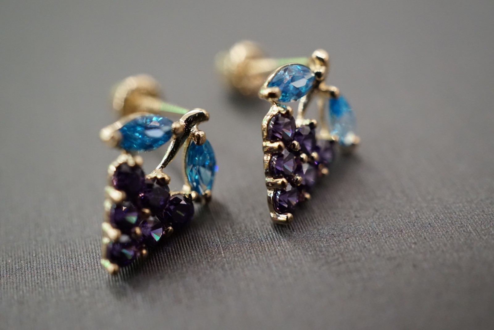 14K Solid Yellow Gold Amethyst Blue Zircon Safety Screw Back Grape Earrings