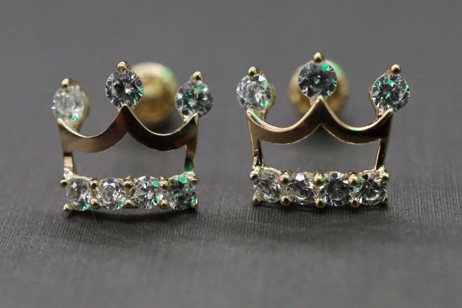 14k Solid Yellow Gold Crown Screw Back CZ Stud Earrings