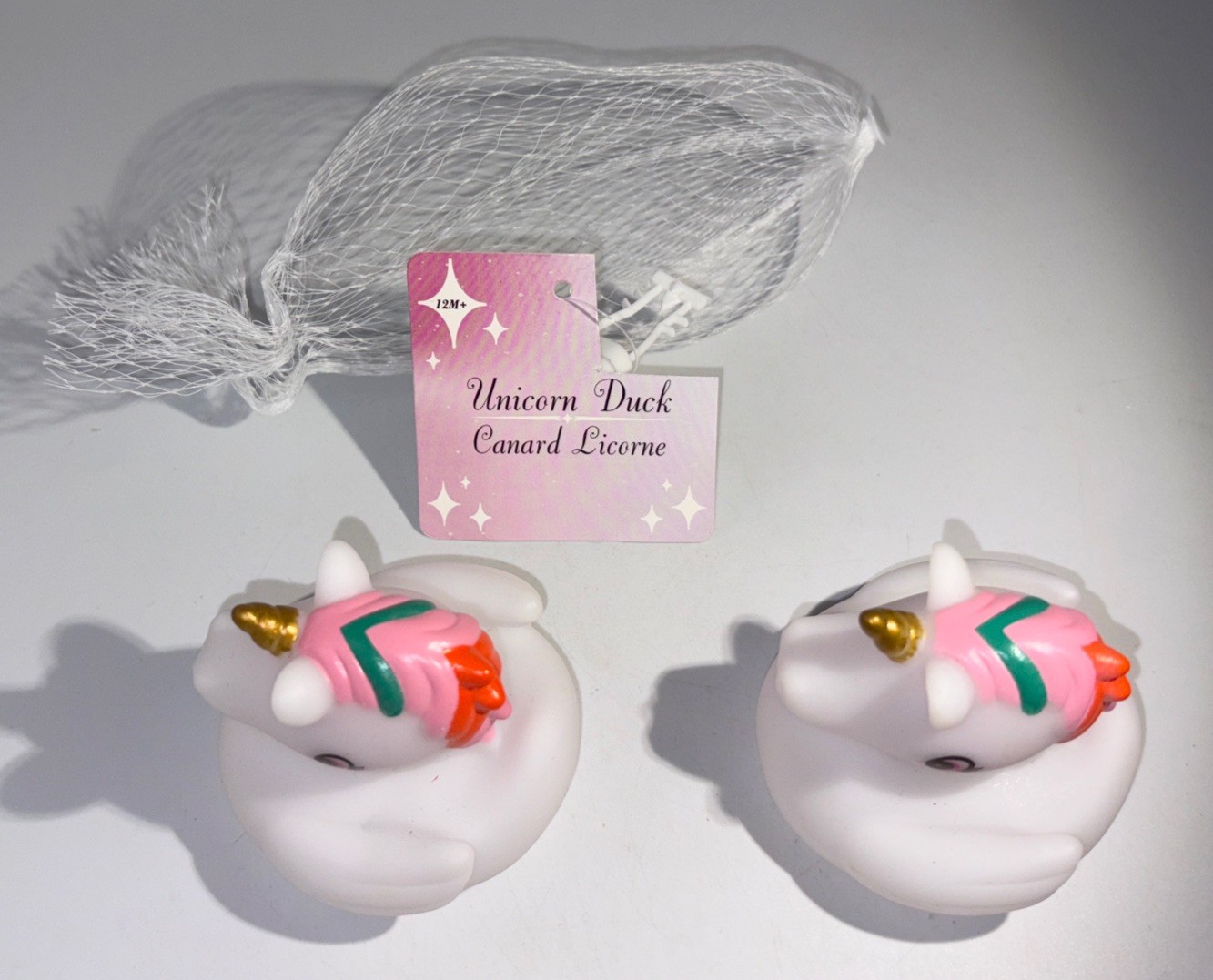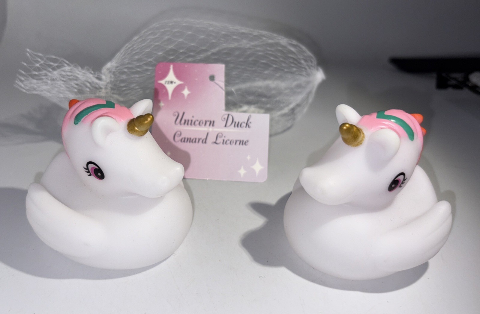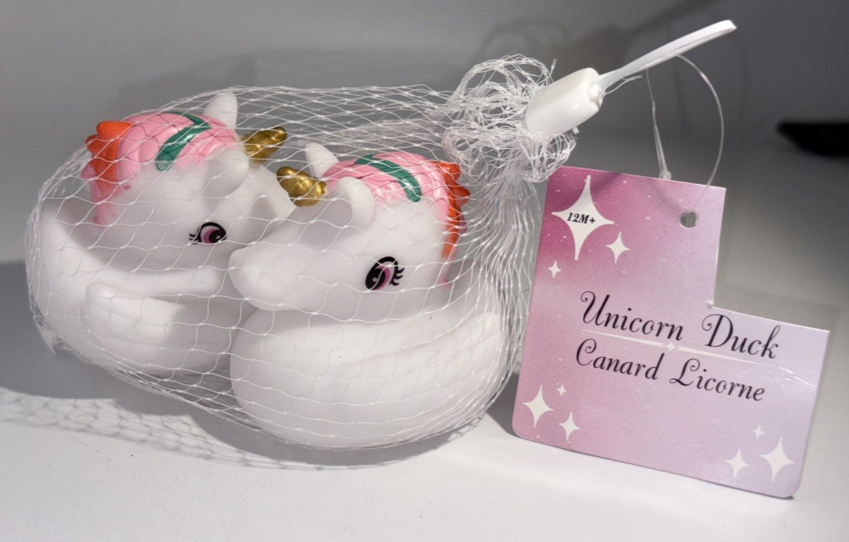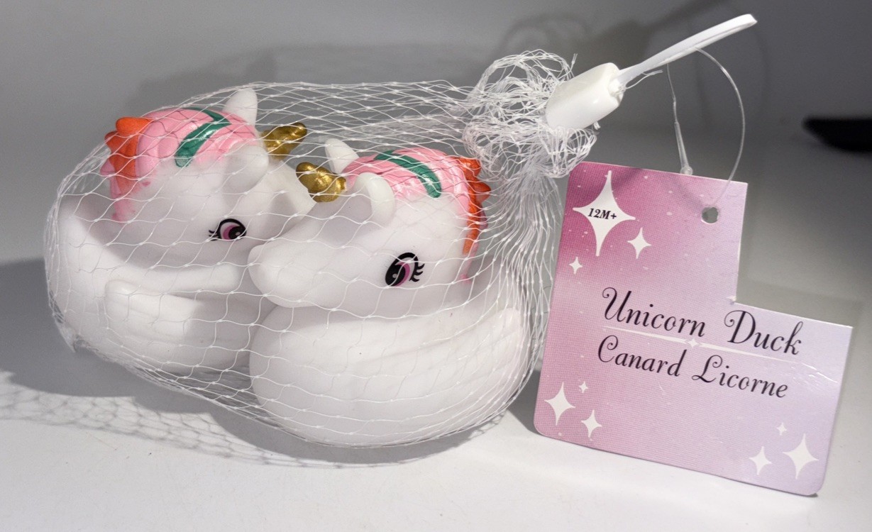 как выглядит KIDS BATH UNICORN RUBBER DUCKS-1 BAG Of 2 COLORED MANE/GOLD HORN JEEP DUCKS-NEW фото