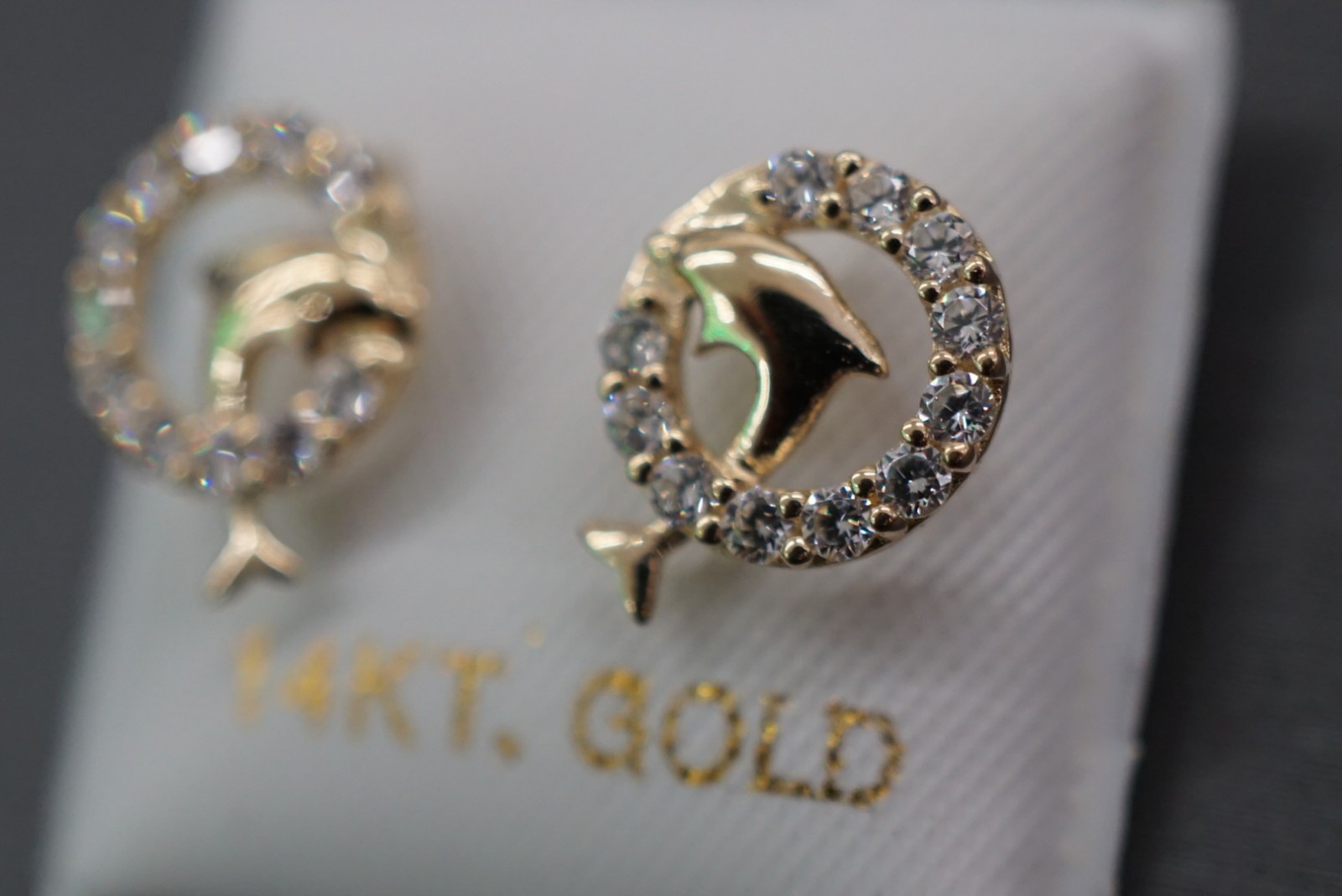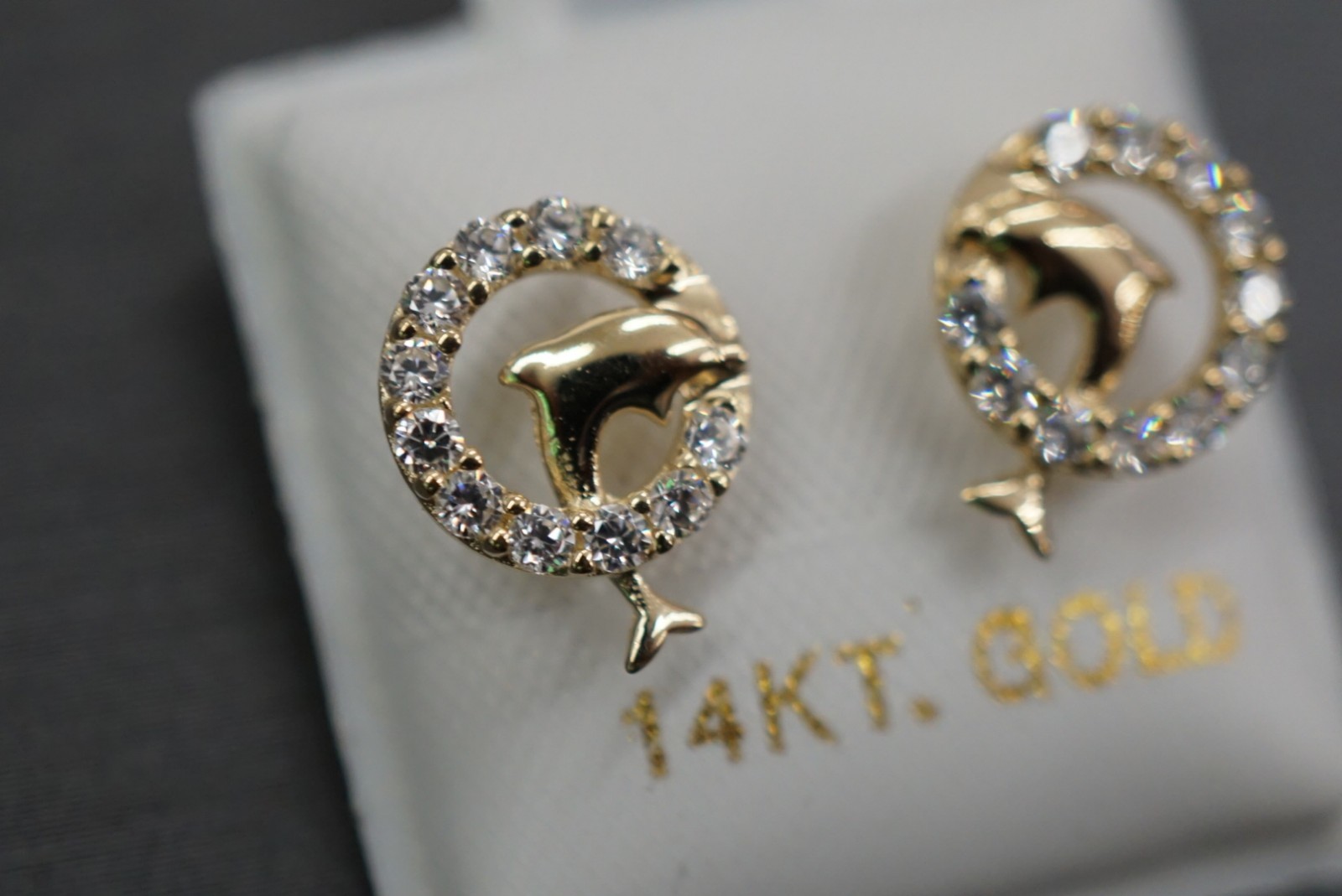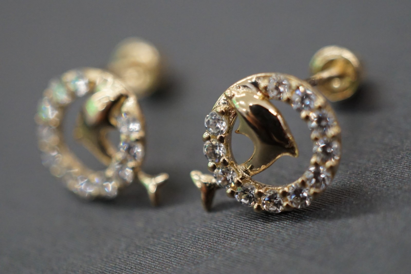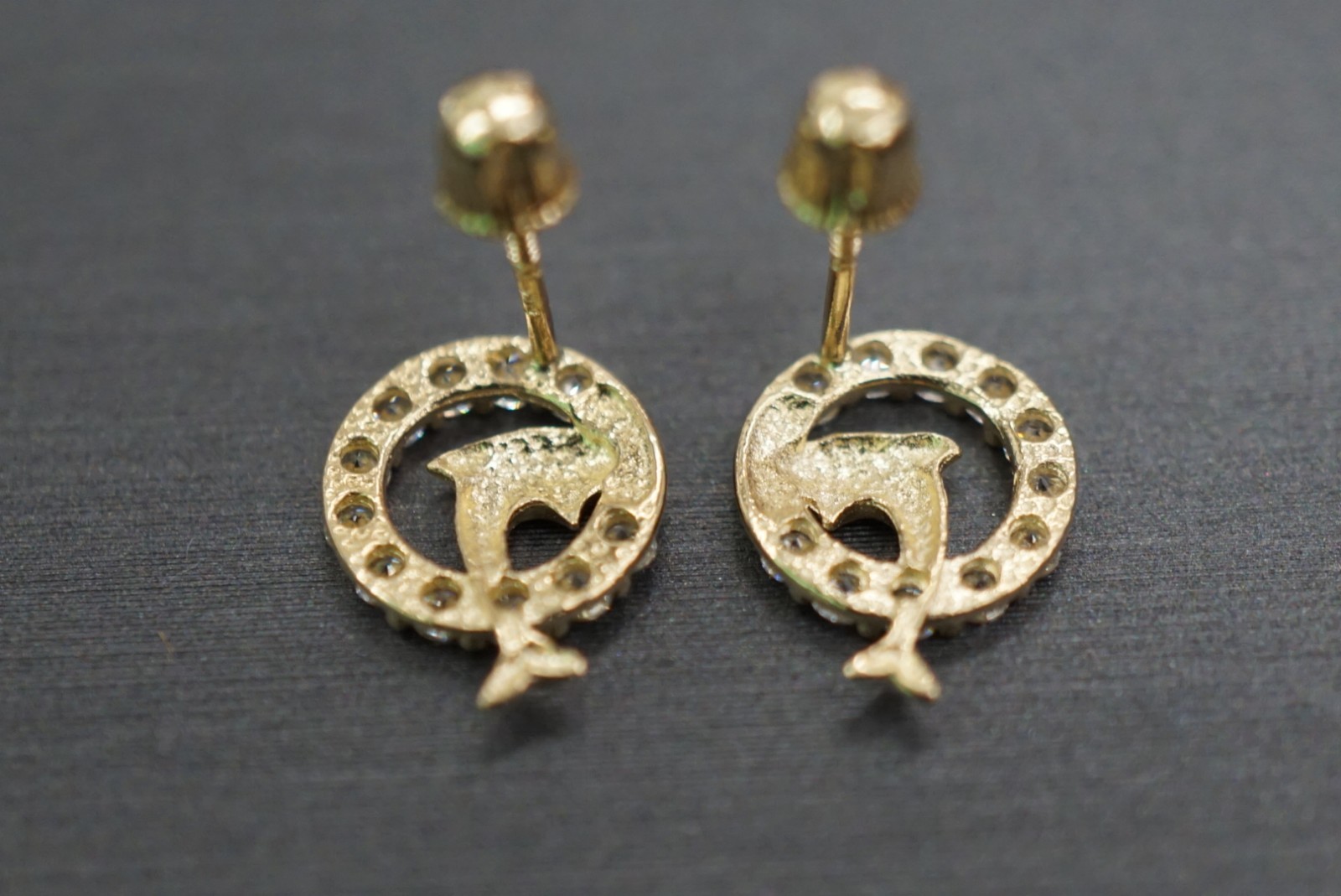 14K Solid Yellow Gold Dolphin With Circle CZ Children Women Screw Back Earrings.