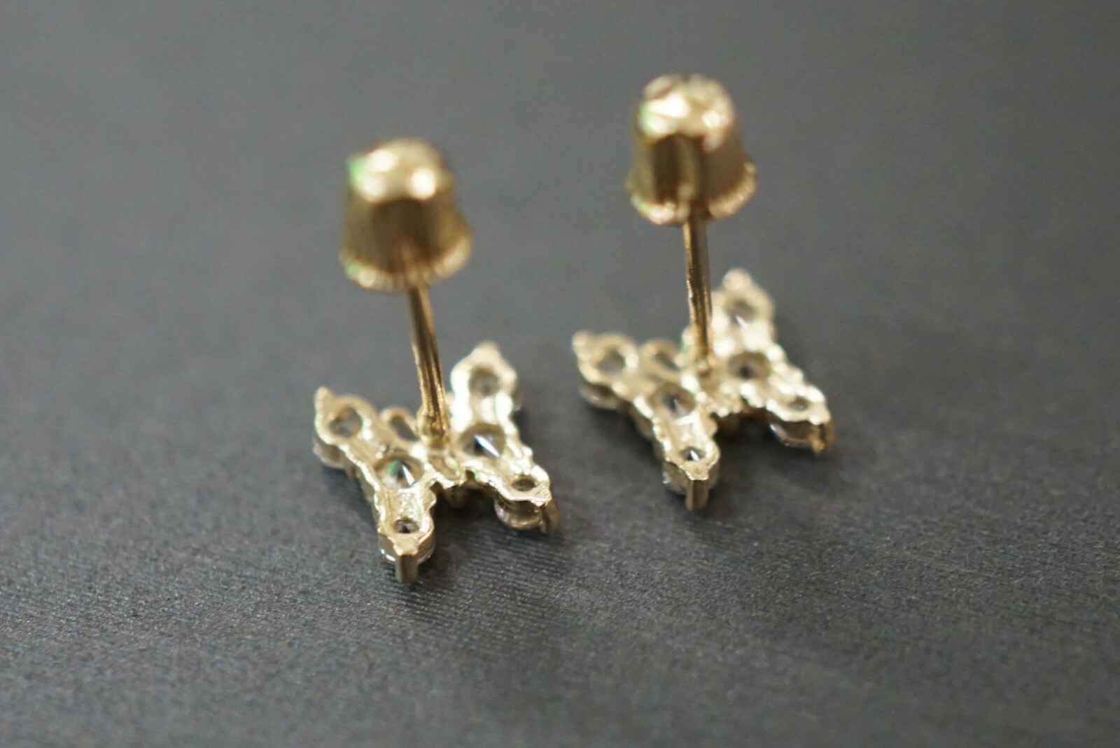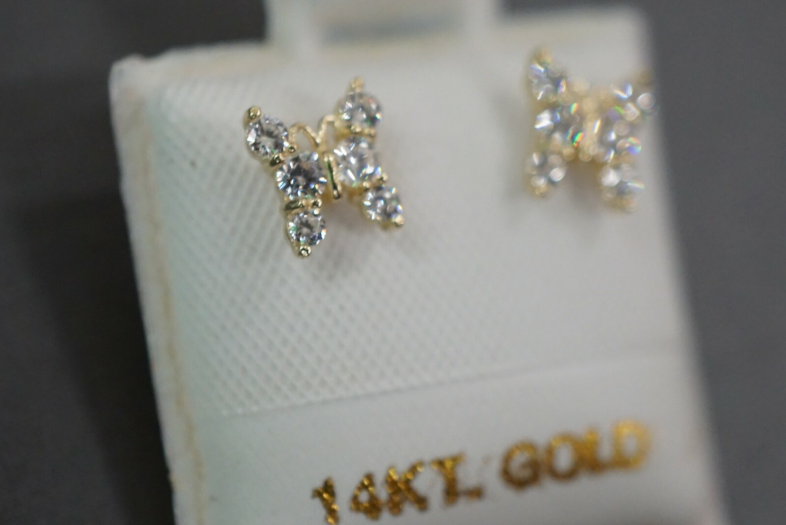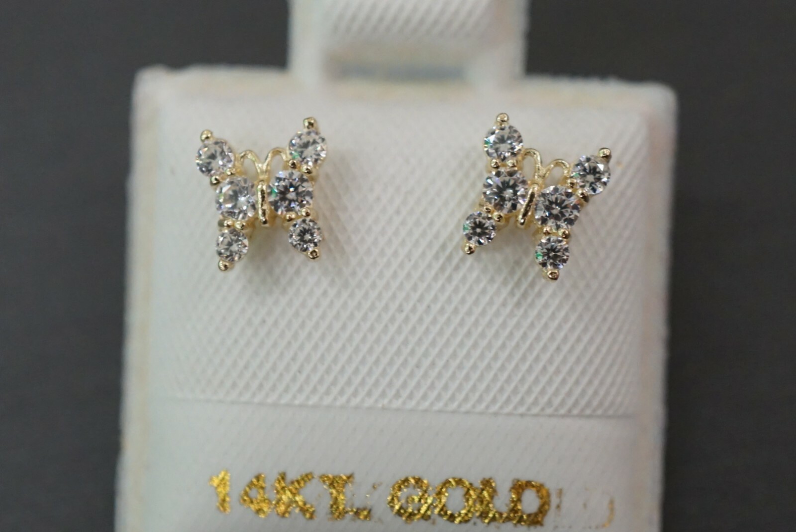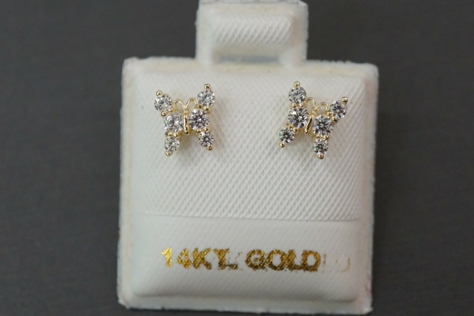 14K Solid Yellow Gold Butterfly Screw Back CZ Earrings. Children Women