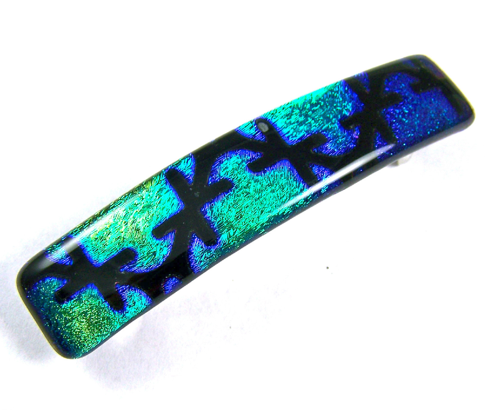 Dichroic Glass Hair Barrette 3.5 Teal Blue Black PinkMosaic Puzzle Zig Zag