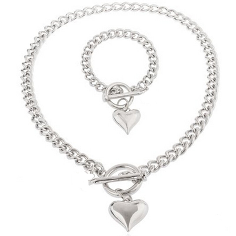 New Womens Jewelry Stainless Steel Silver Heart Curb Chain Necklace Bracelet Set
