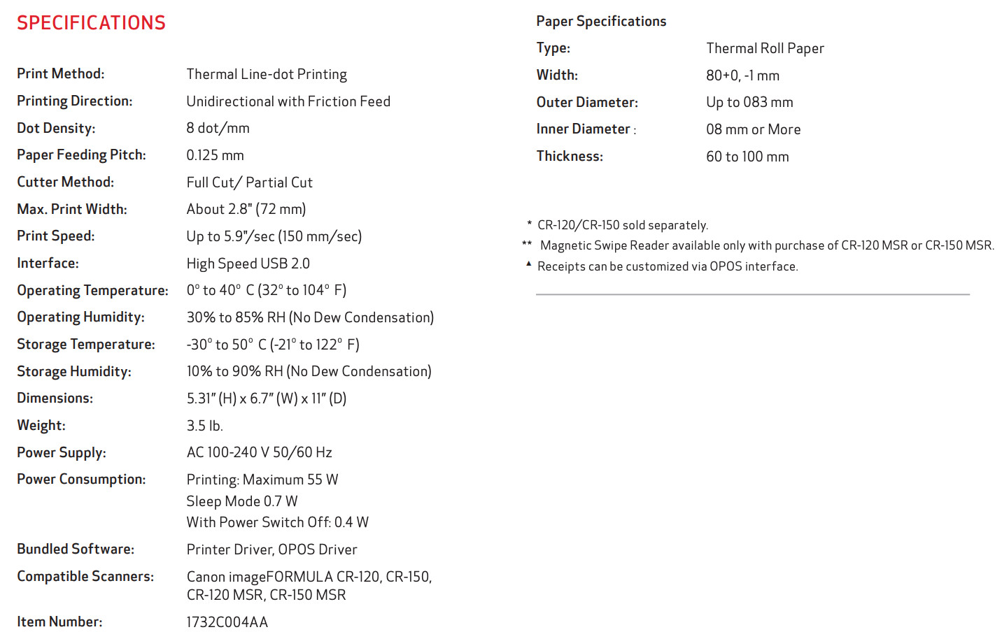 Supported Paper Size: Receipt Paper, 3.15 in