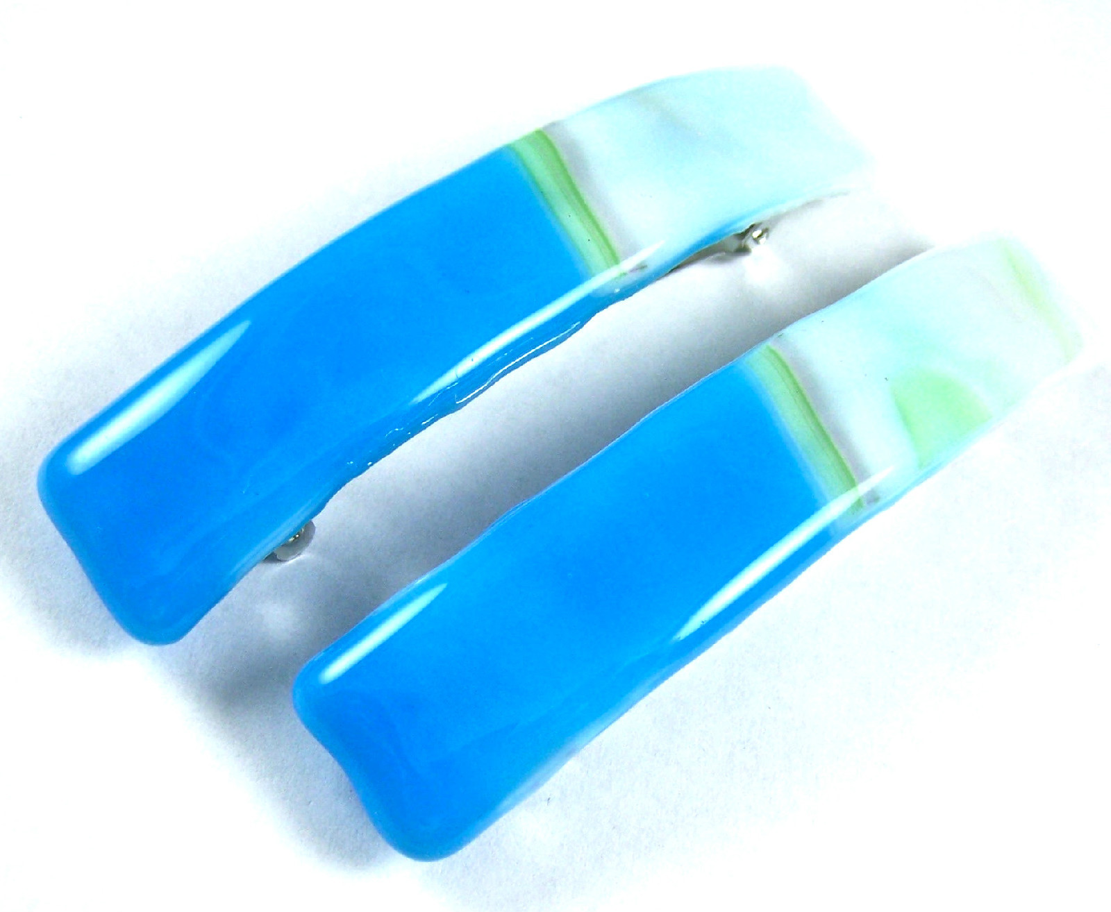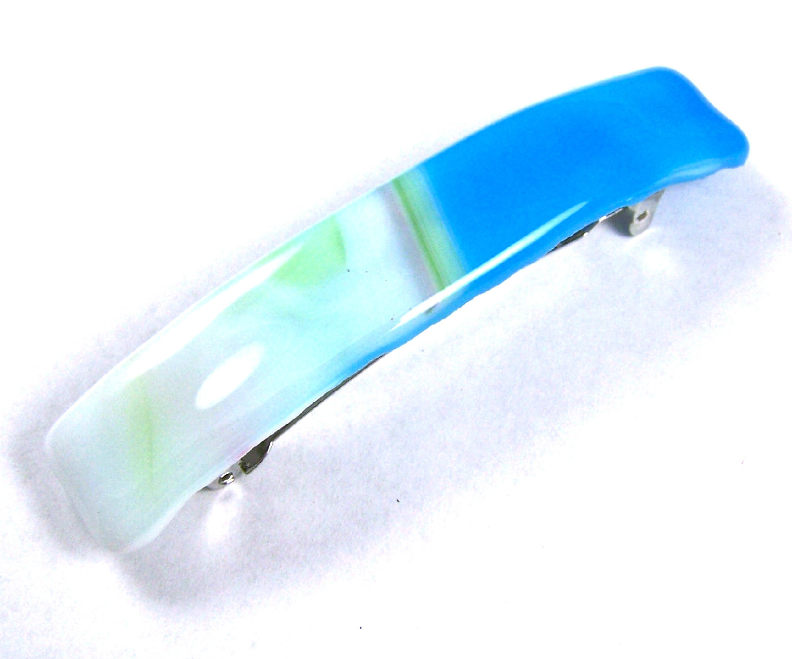 Stained GLASS BARRETTE 3.5 90mm White Aqua BLUE Green Striped Swirl Large Clip
