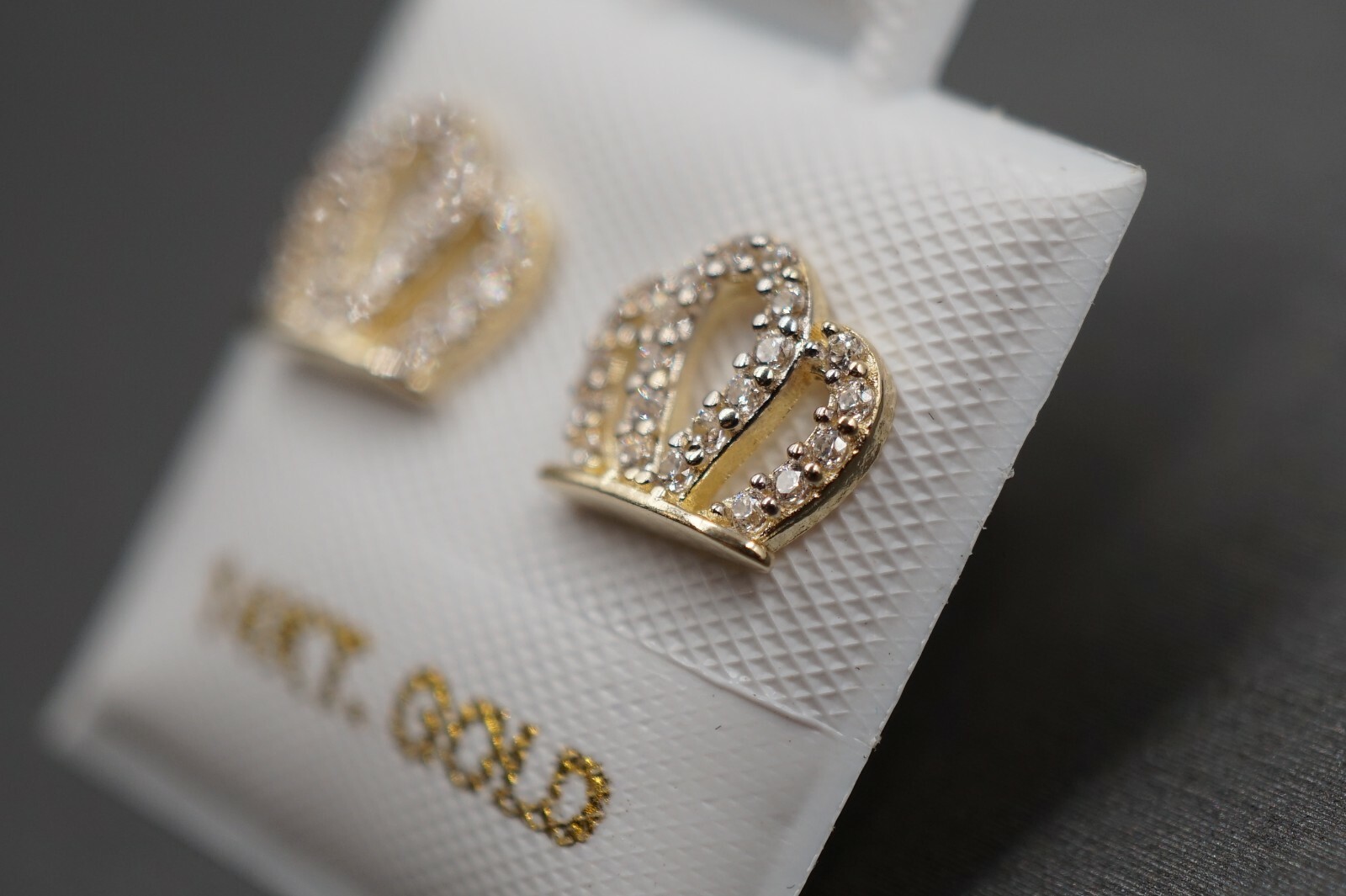 как выглядит 14K Solid Yellow Gold 9mm x 7.5 mm Crown CZ Stud Earring. фото