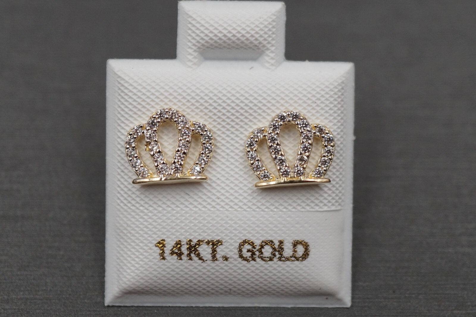 14K Solid Yellow Gold 9mm x 7.5 mm Crown CZ Stud Earring.