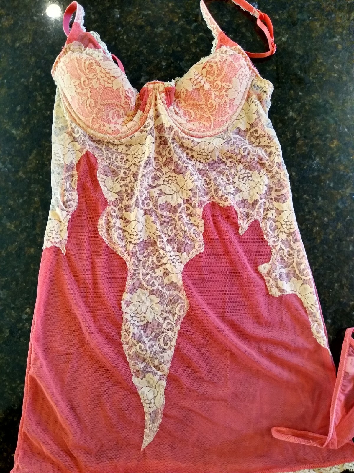 FREDERICKS OF HOLLYWOOD NWT SZ. S PEACH LACE BRA TOP TEDDY W/MATCHING THONG