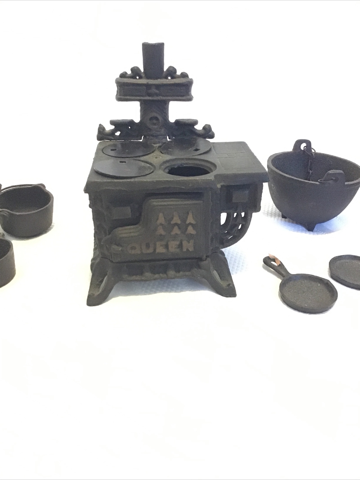 как выглядит Vintage Cast Iron Toy Stove And Accessories фото