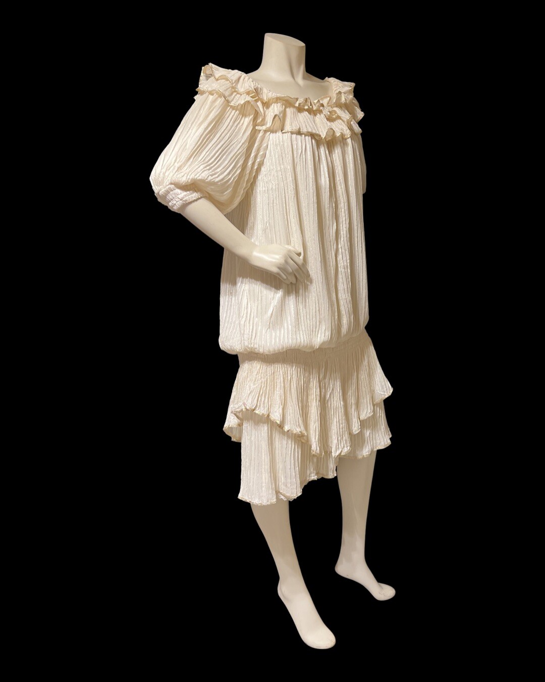 VTG Damianou Beige Dress On Or Off Shoulder MINI Ruffles Tiered Fancy Flouncy M