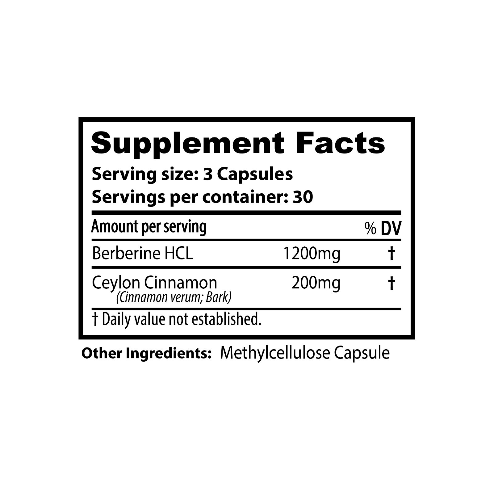 Active Ingredients: Berberine, Ceylon cinnamon, Microcrystalline cellulose, Methylcellulose Capsule