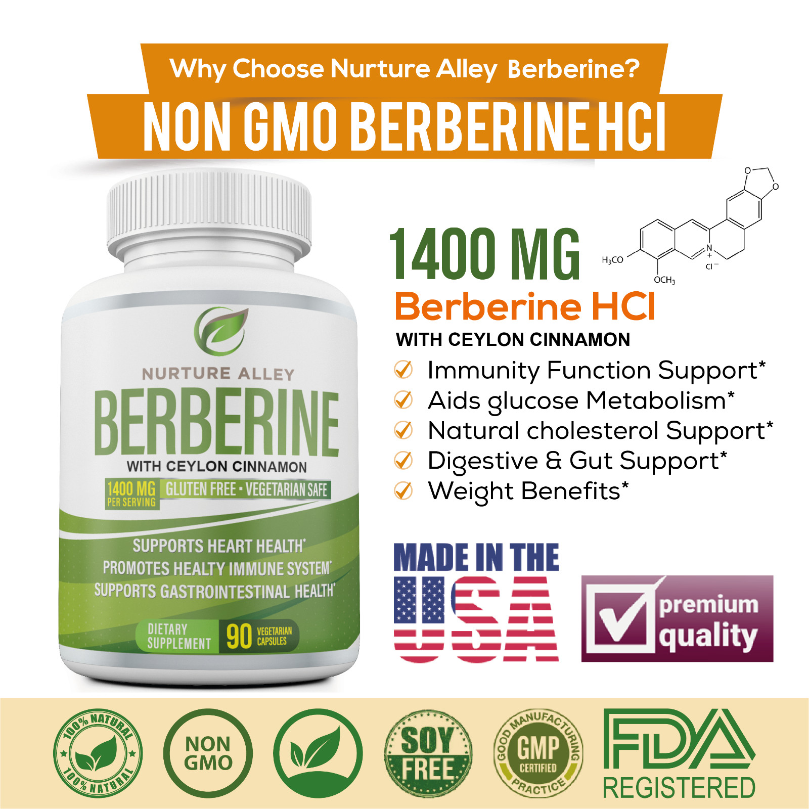 Nurture Alley Premium Berberine HCL 1400mg Plus Organic Ceylon Cinnamon 90 Caps