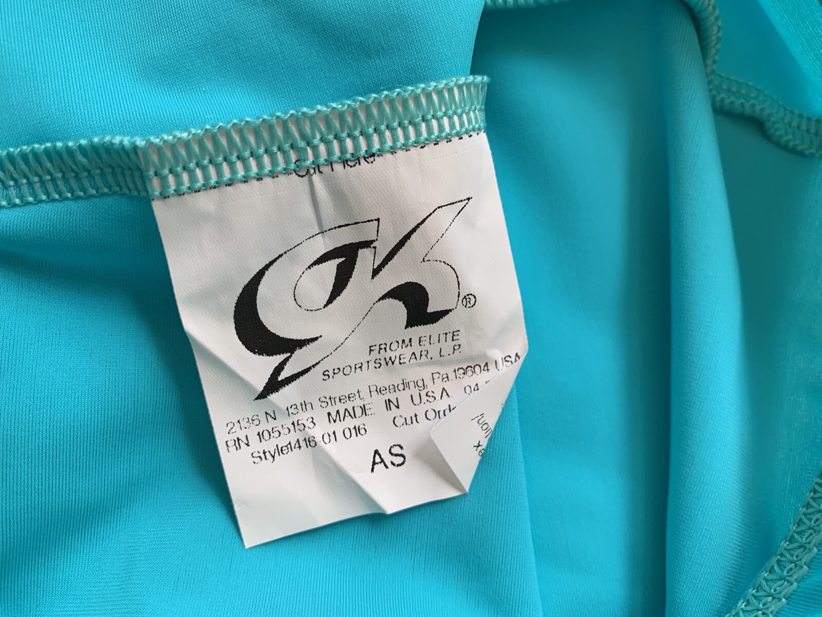 как выглядит GK Elite BAR SHORTS Leotard Gymnastics LIGHT BLUE Black Logo NYLON Spandex Sz AS фото