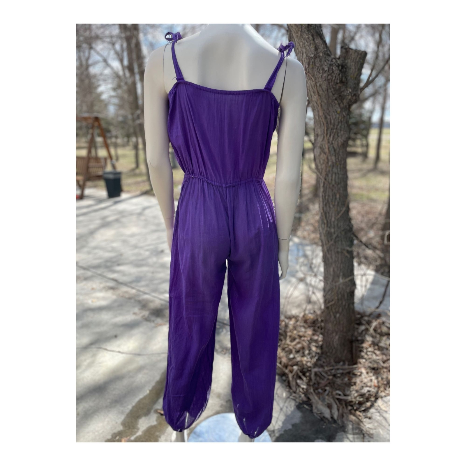 как выглядит Vintage 90s Cotton Weave Jumpsuit Tie Straps Crotchet Bodice Wide Jogger Leg фото