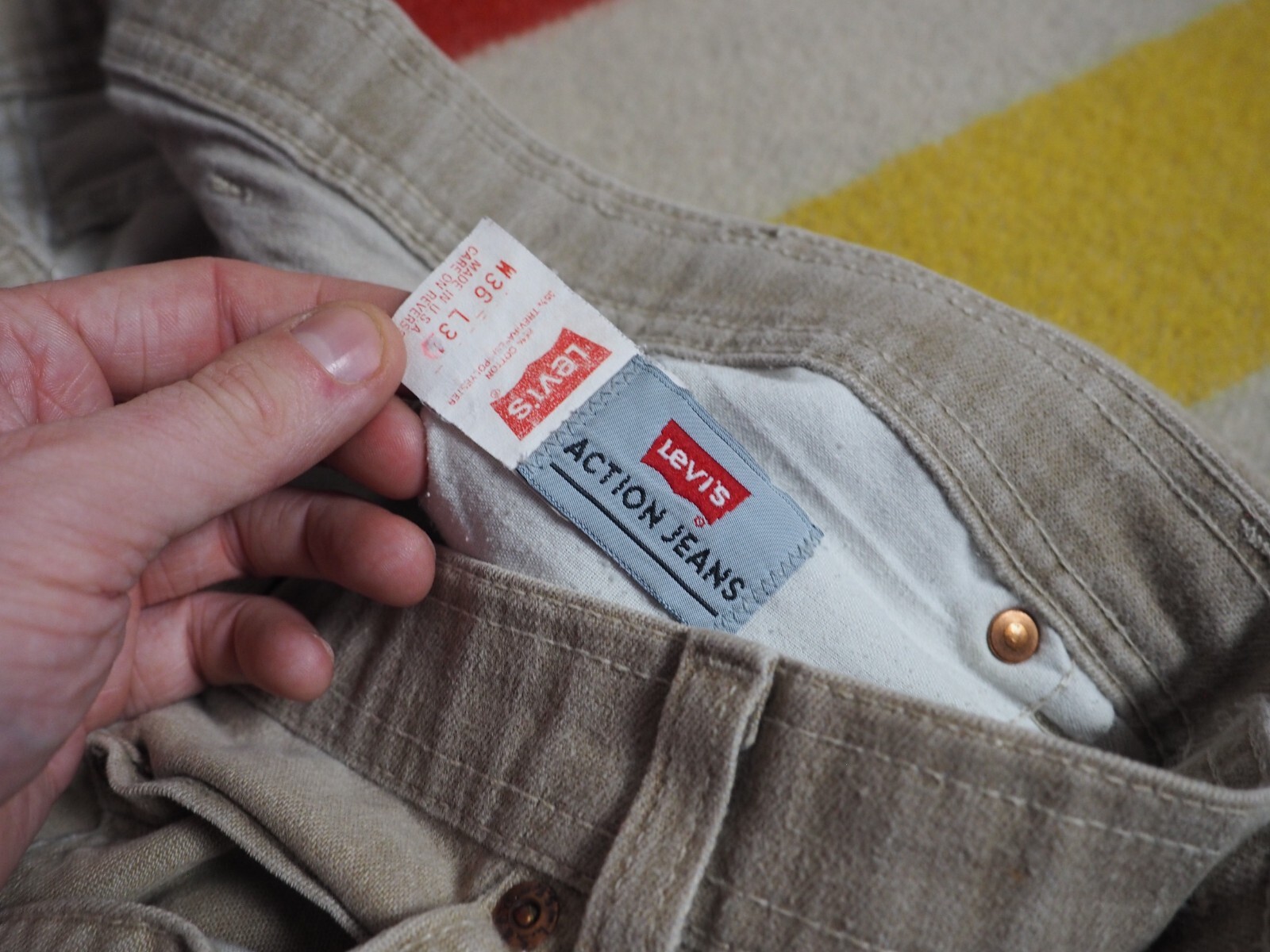 VTG 90s Levi s Action Jeans Beige Cropped 33x26 Logo Outdoor Summer Pants EUC