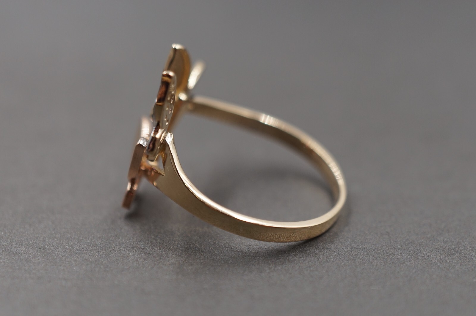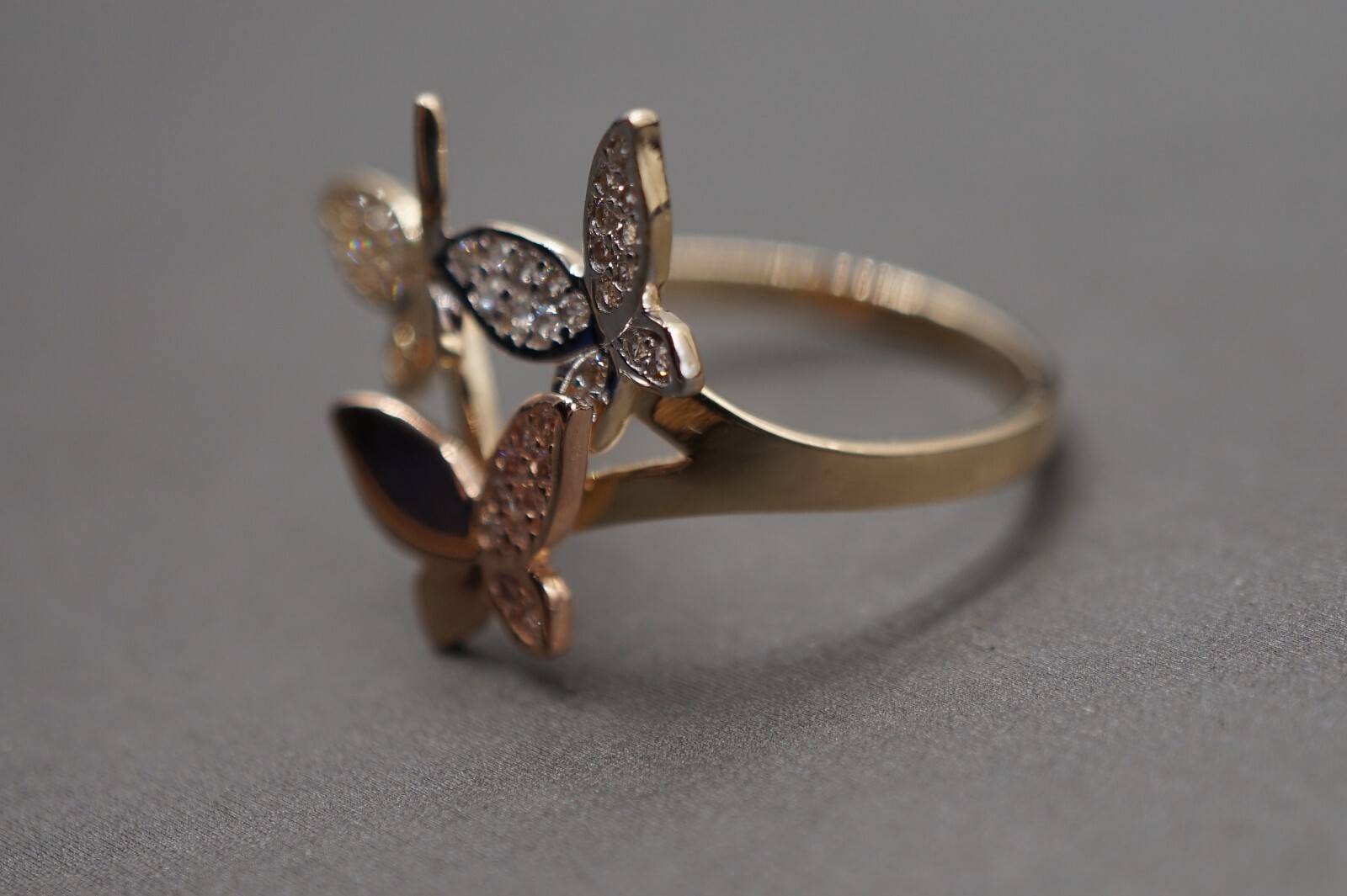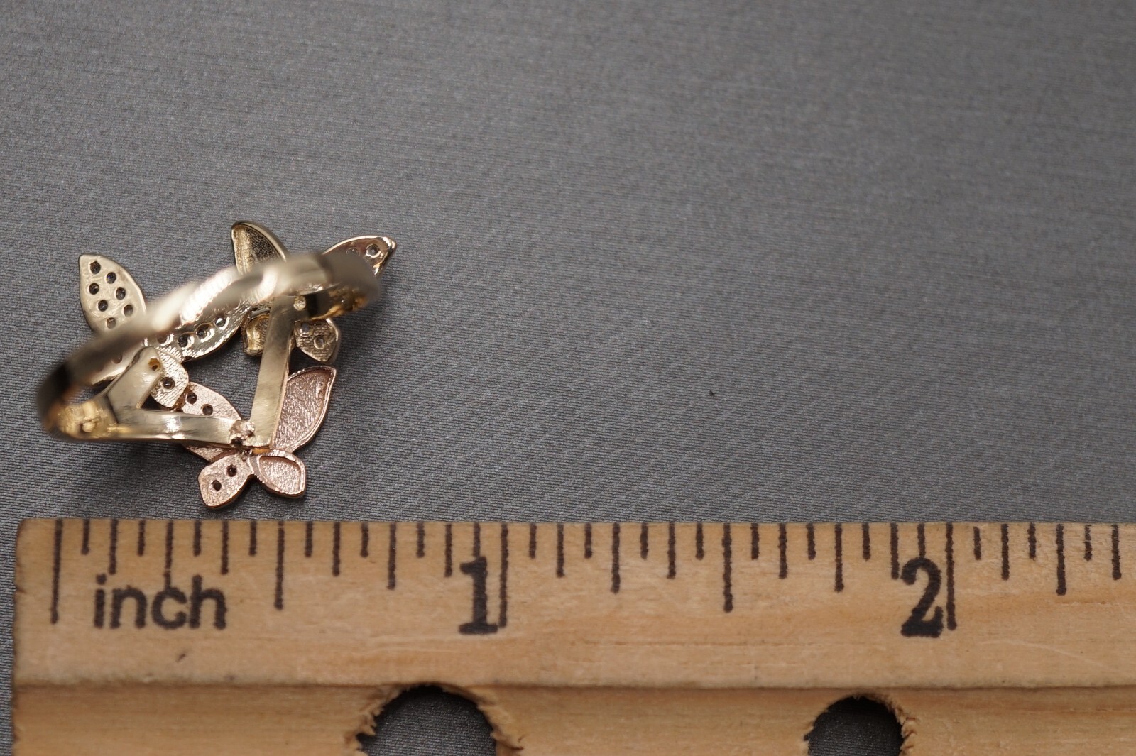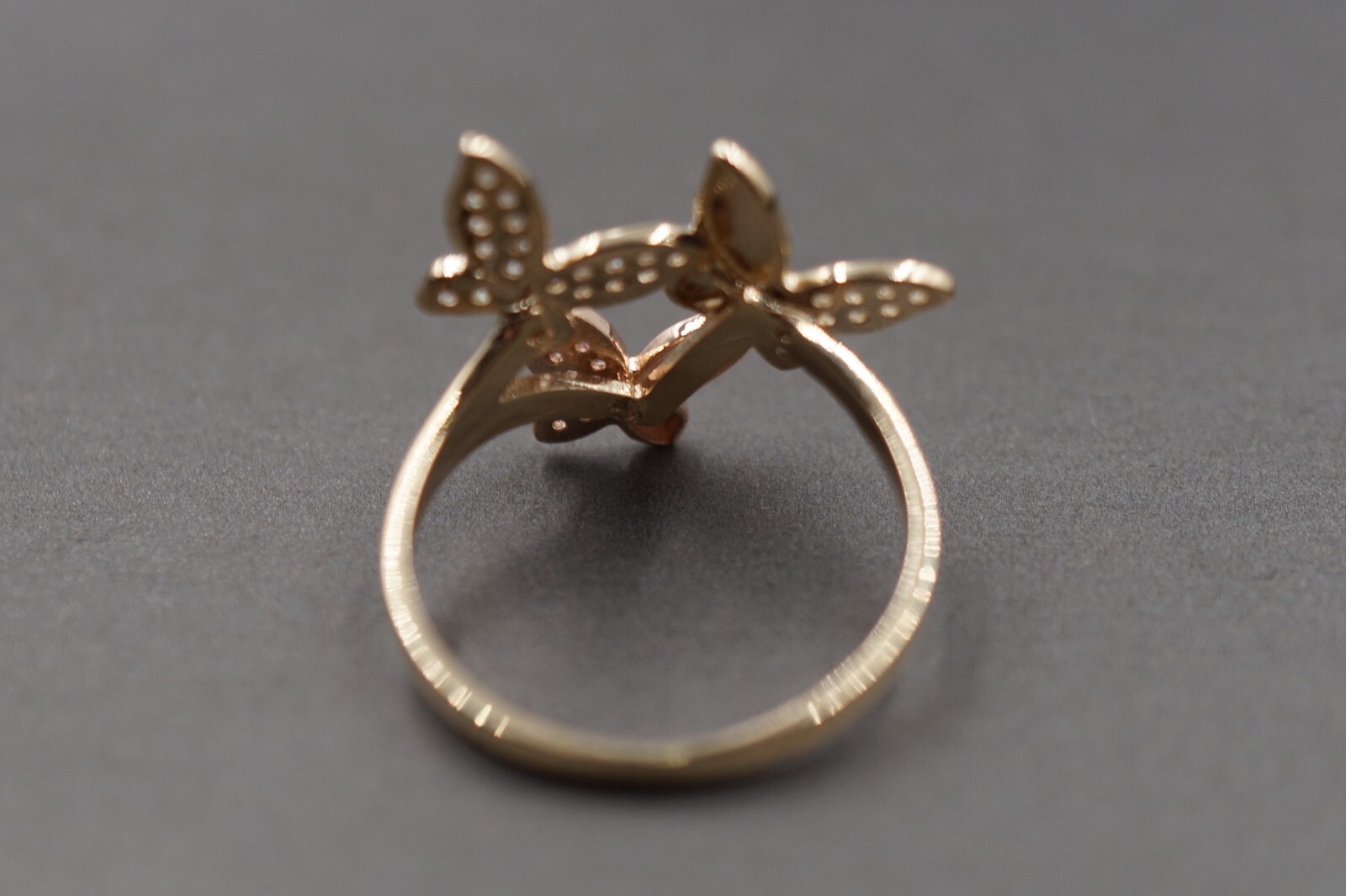 как выглядит 14K Solid Yellow Gold Multi Tone Fancy Three Butterfly CZ Band Ring. Size 7.5 фото