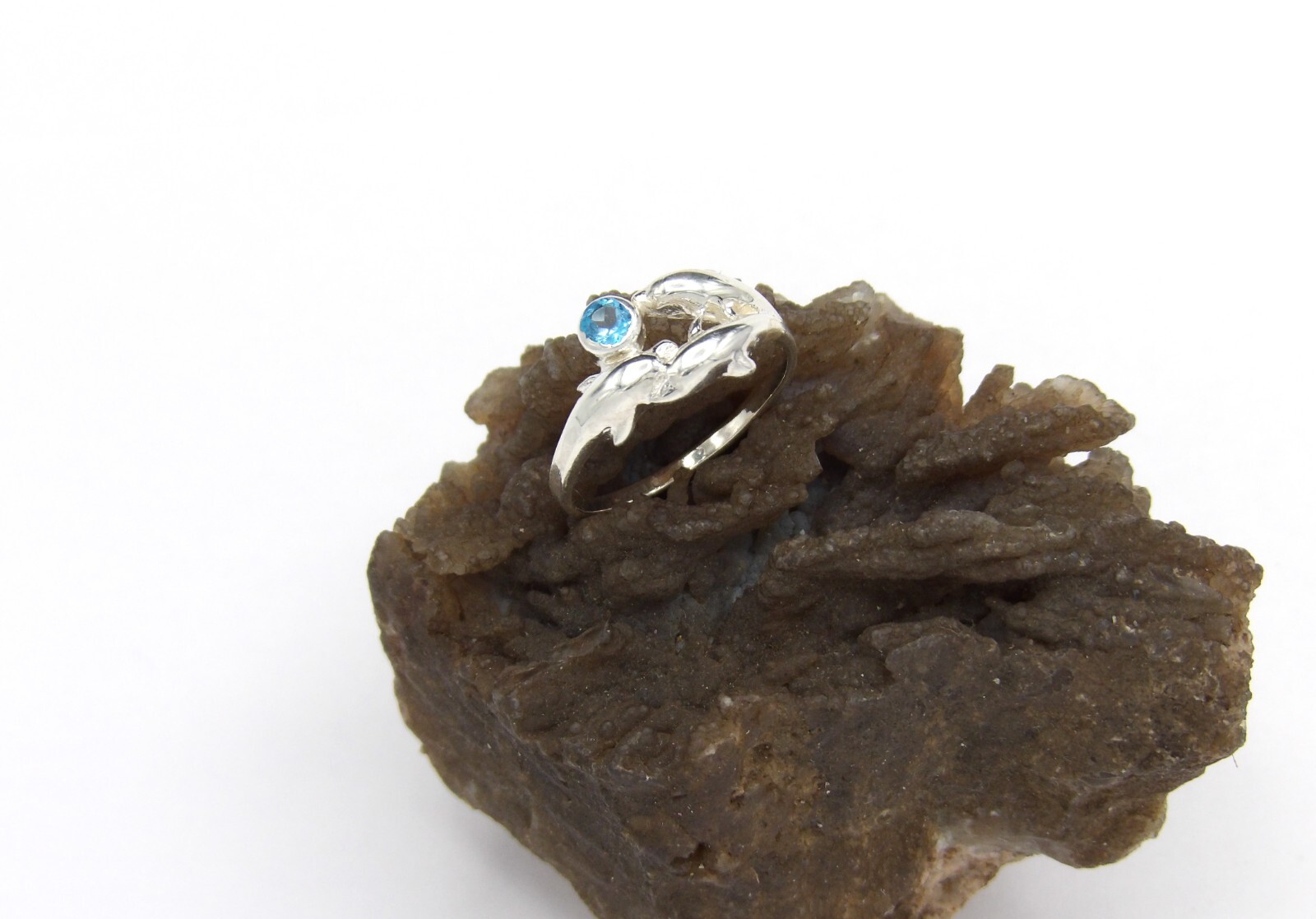 .925 Sterling Silver Three Dolphins Ring Handcrafted with 4mm Swiss Blue Topaz