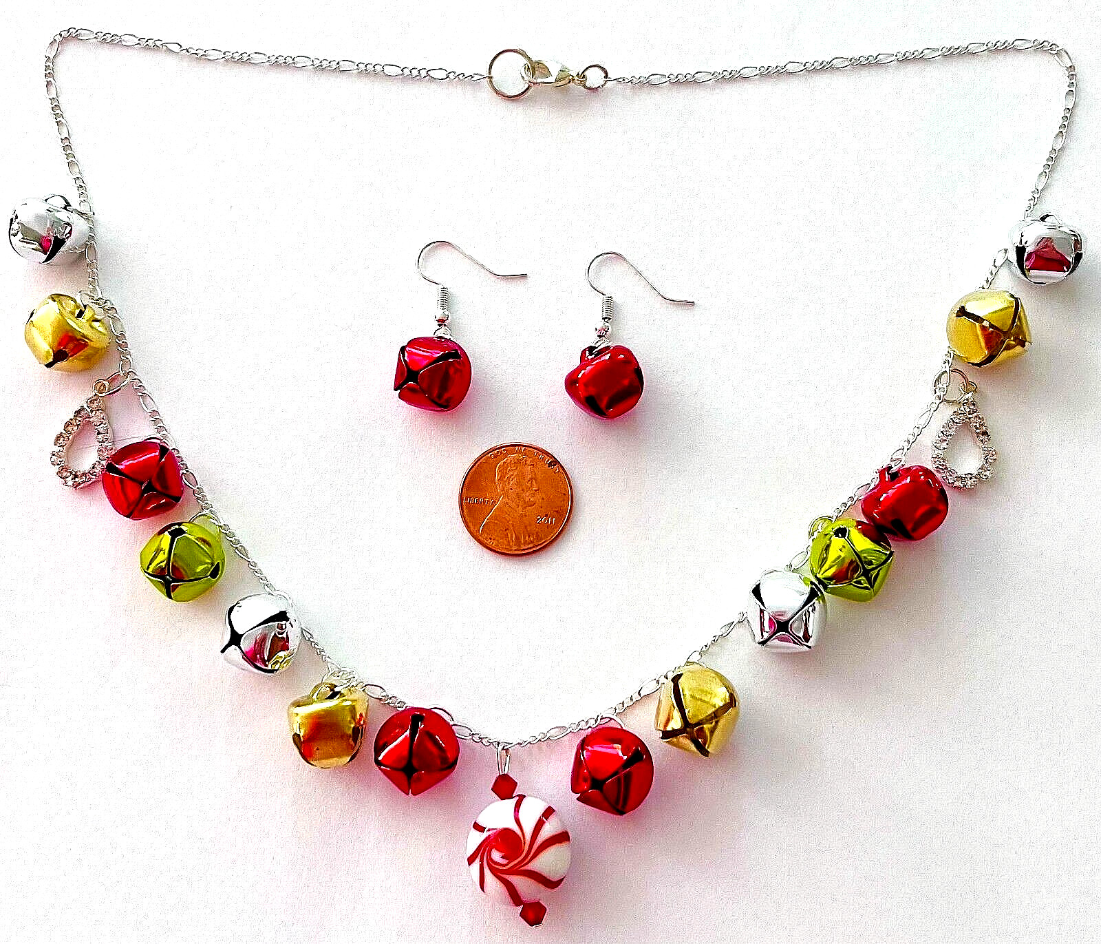 CHRISTMAS JINGLE BELL NECKLACE/ EARRINGS- 17 DROPS-MULTI-HANDCRAFTED-20 - 878