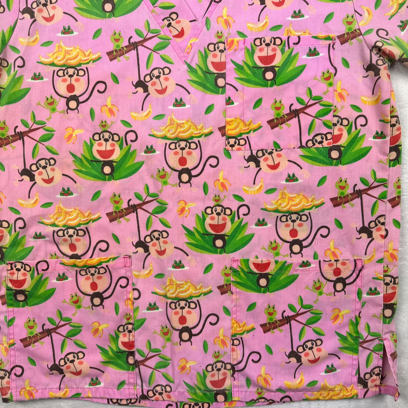 как выглядит Just Love Scrub Top Womens Small Pink V-Neck 3 Pocket Monkey Bananas Frog фото