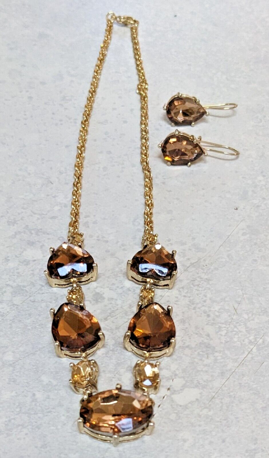 Gold Brown Pendant Set Necklace Pierced Earrings