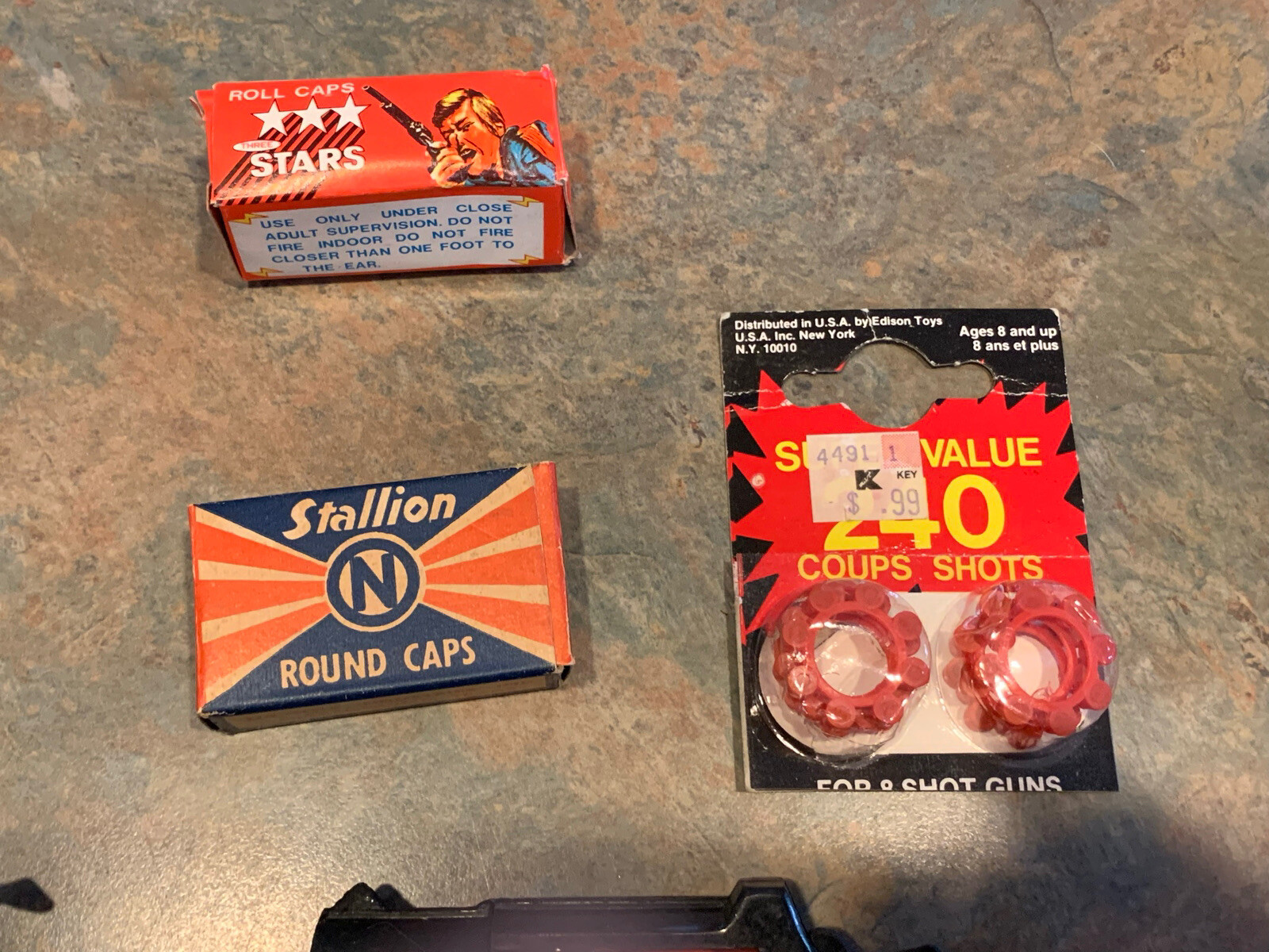 MIXED LOT OF 5 VINTAGE TOY CAP GUNS AND CAPS