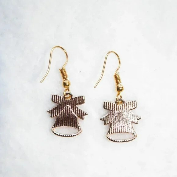 Red Gold Christmas Bells Earrings Drop 5/8 Green Bow