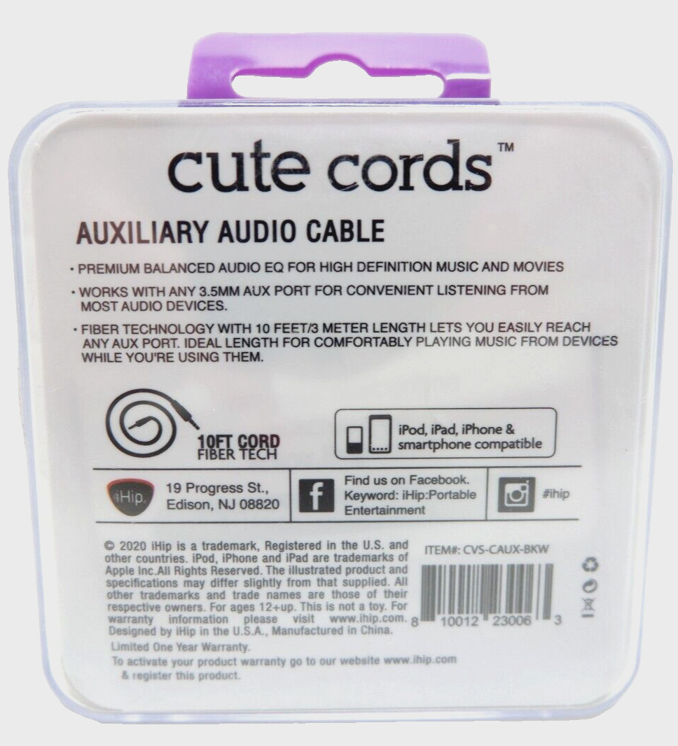 Iphone iHip Cute Cords Braided Auxiliary Audio Cable 10 Foot White / 3.5 mm