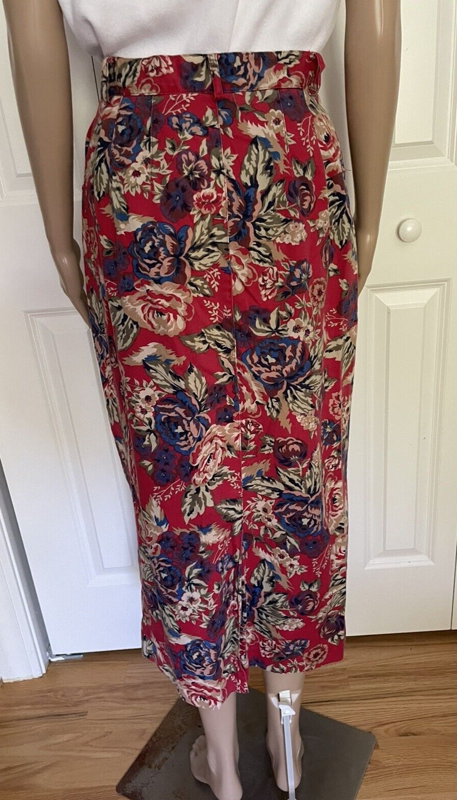 как выглядит Vintage Talbots 8 Red Blue Floral Cotton Twill Long Skirt, Front Zip, Back Slit фото