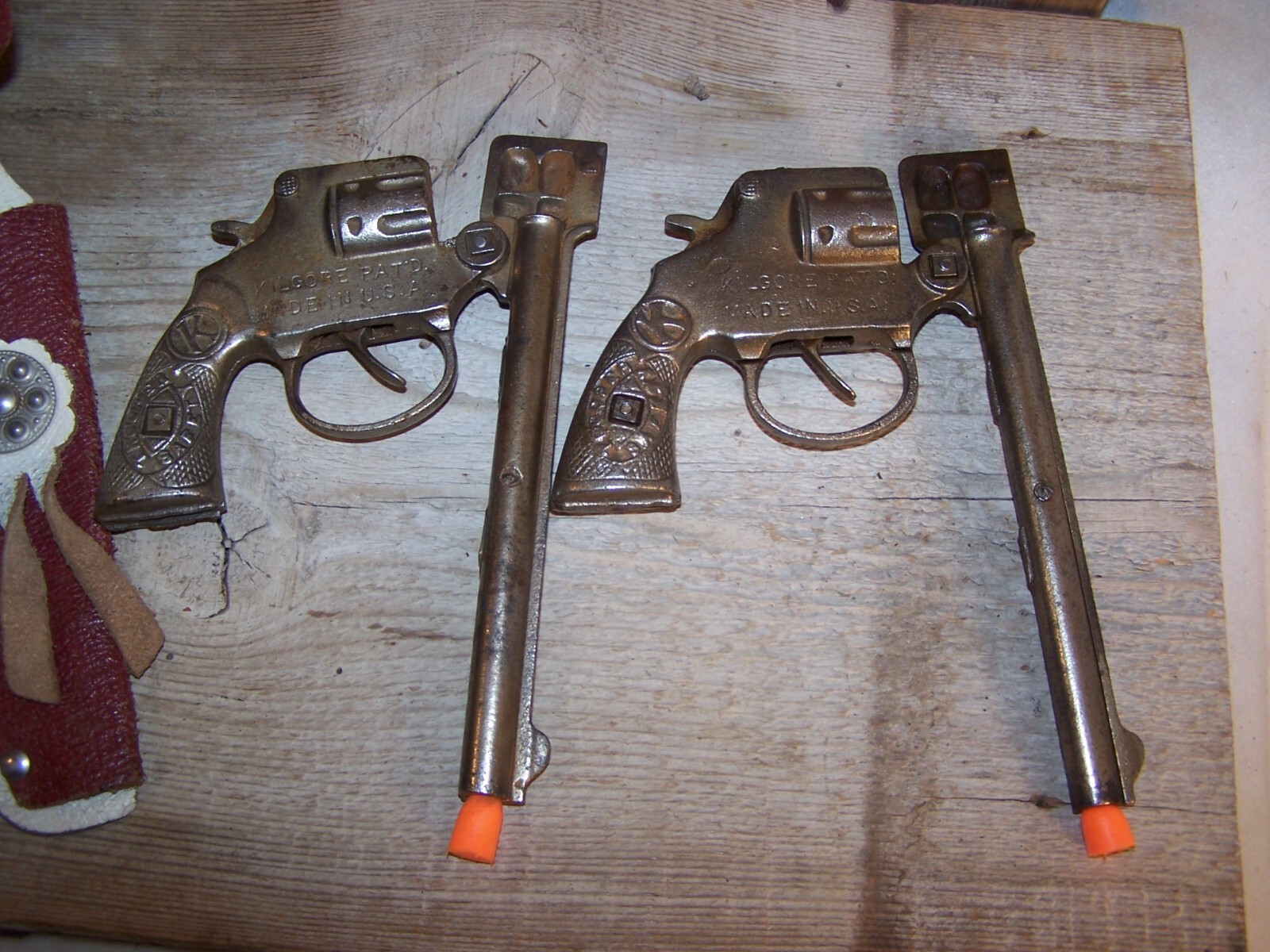 Vintage Pair 2 Kilgore 'Trooper' Cap Guns w/ 3 Gun Leather Holster - Working