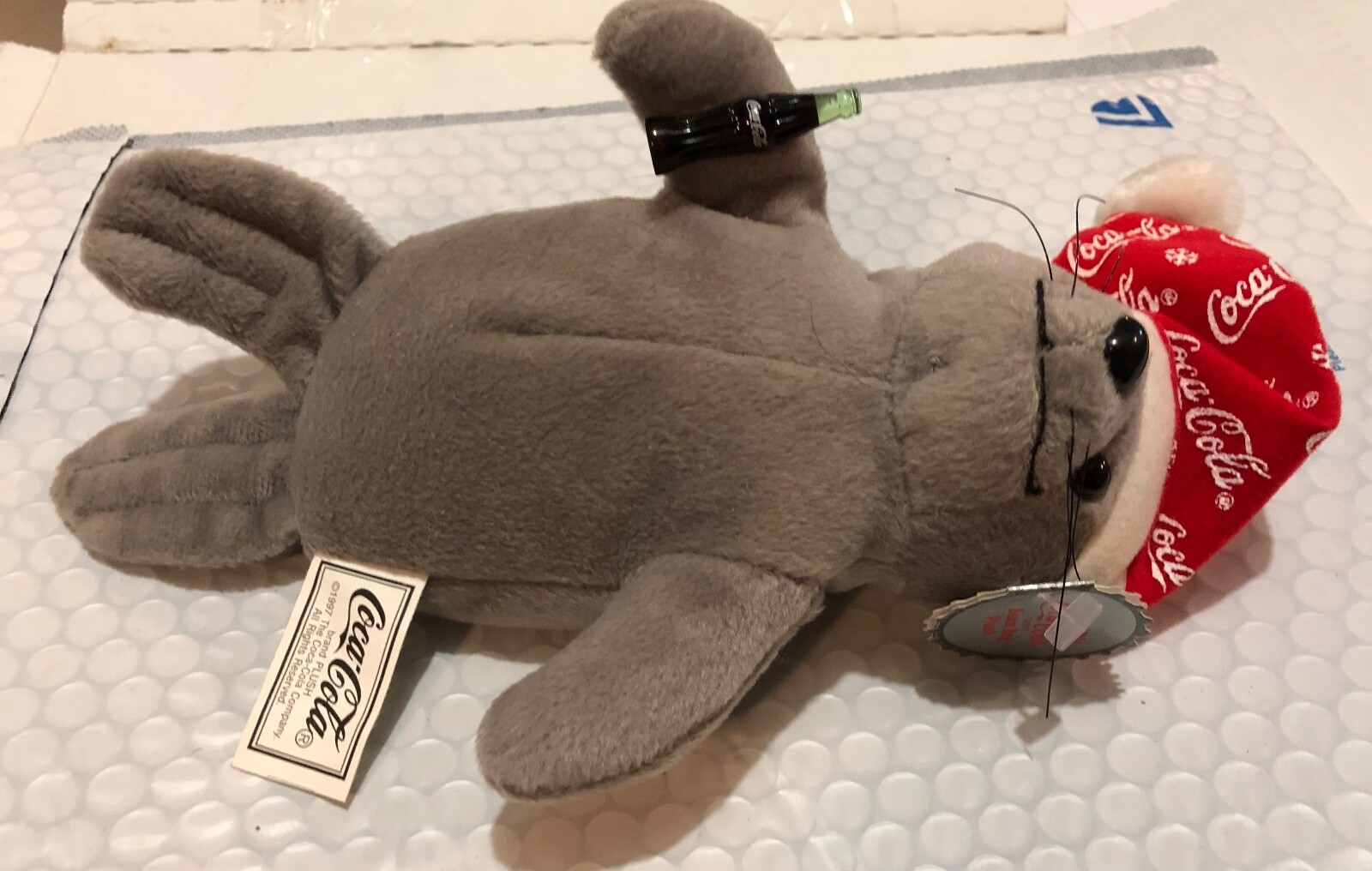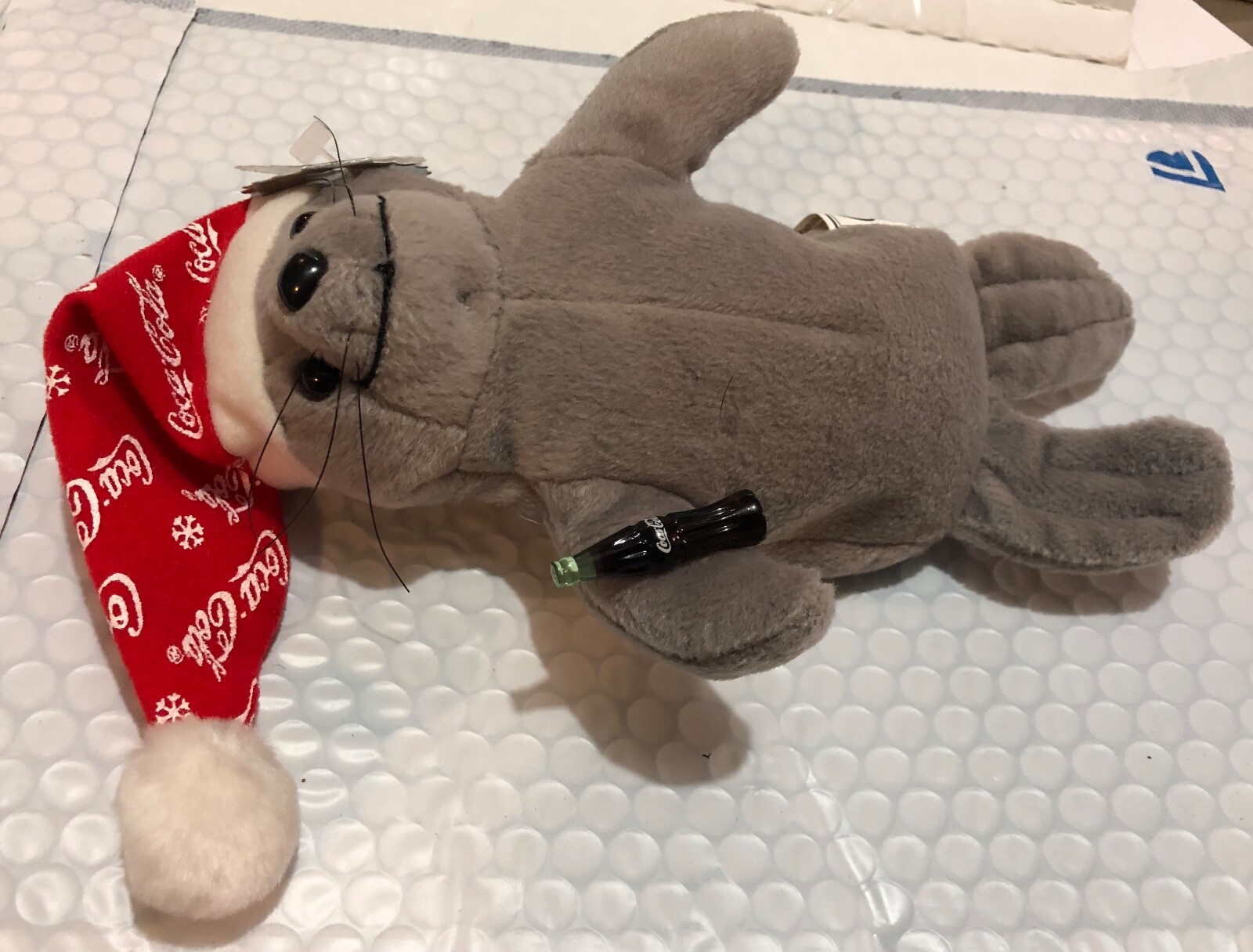 • VTG 1997 Coca-Cola Plush Seal in Red Snowflake Cap Christmas Coke Bottle