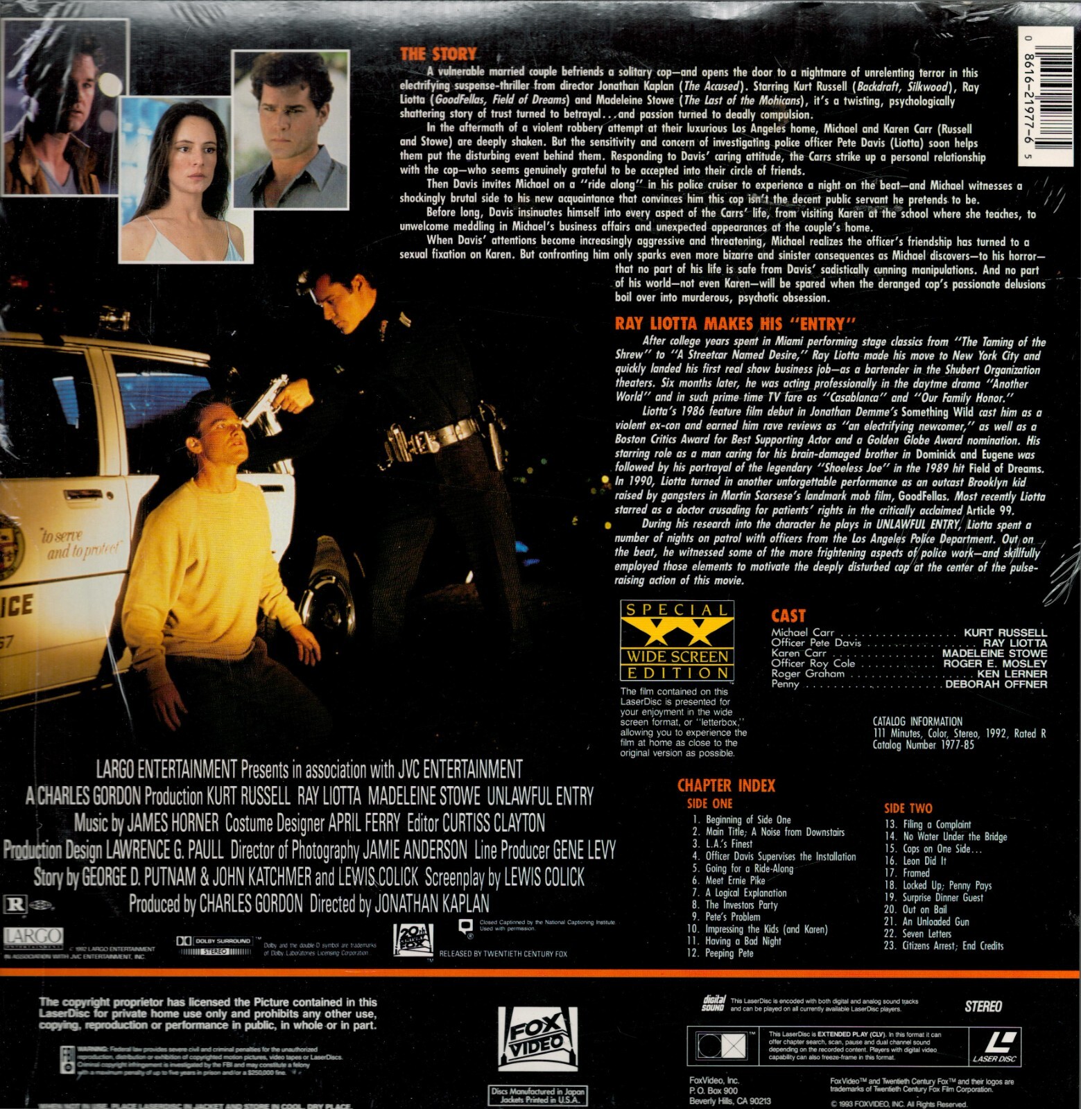 Unlawful Entry Laser Disc Special Widescreen Edition Kurt Russell Ray Liotta 93