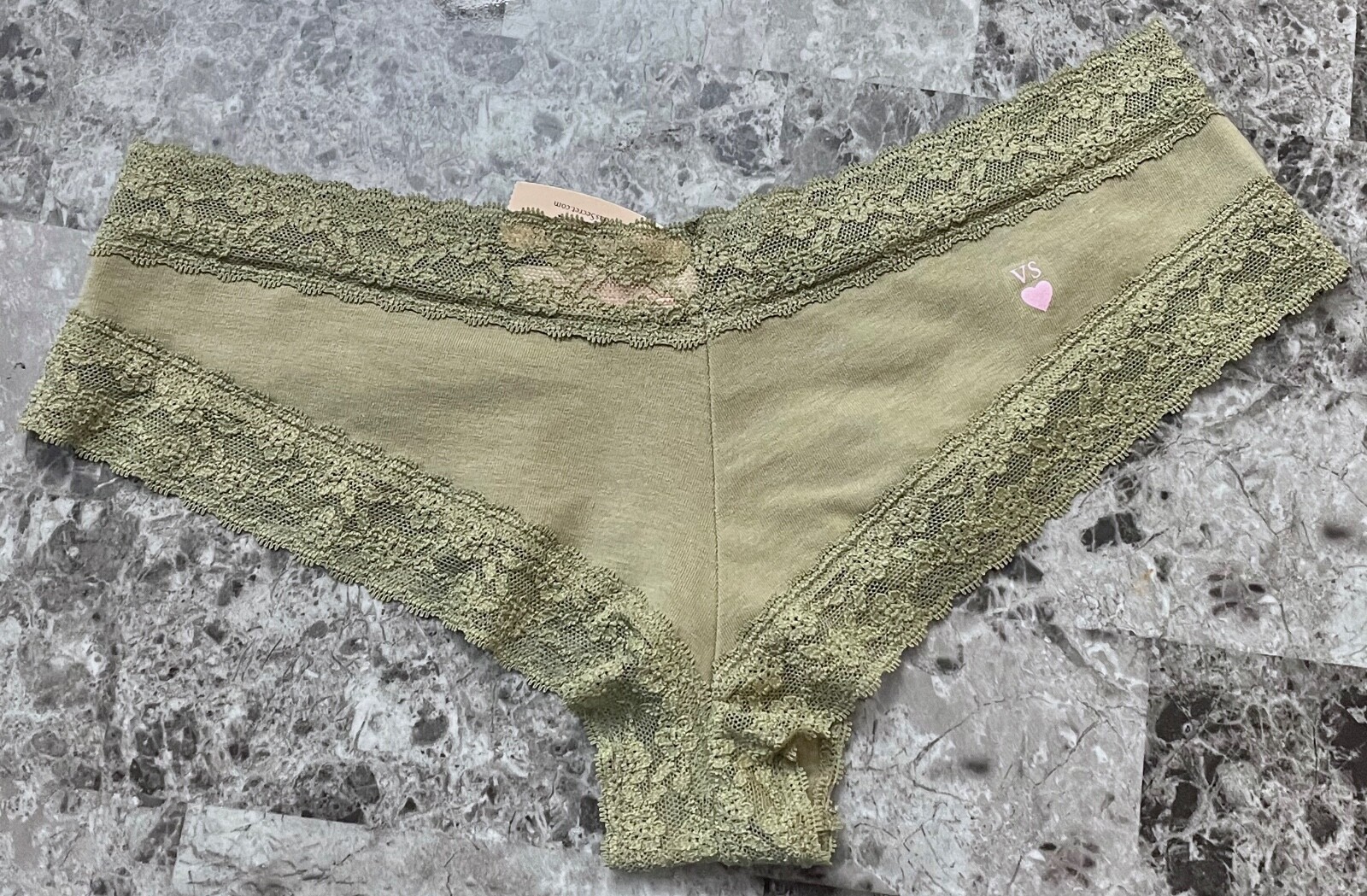 как выглядит NWT VICTORIAS SECRET M GREEN PINK HEART LOGO FLORAL LACE RARE CHEEKY PANTIES фото