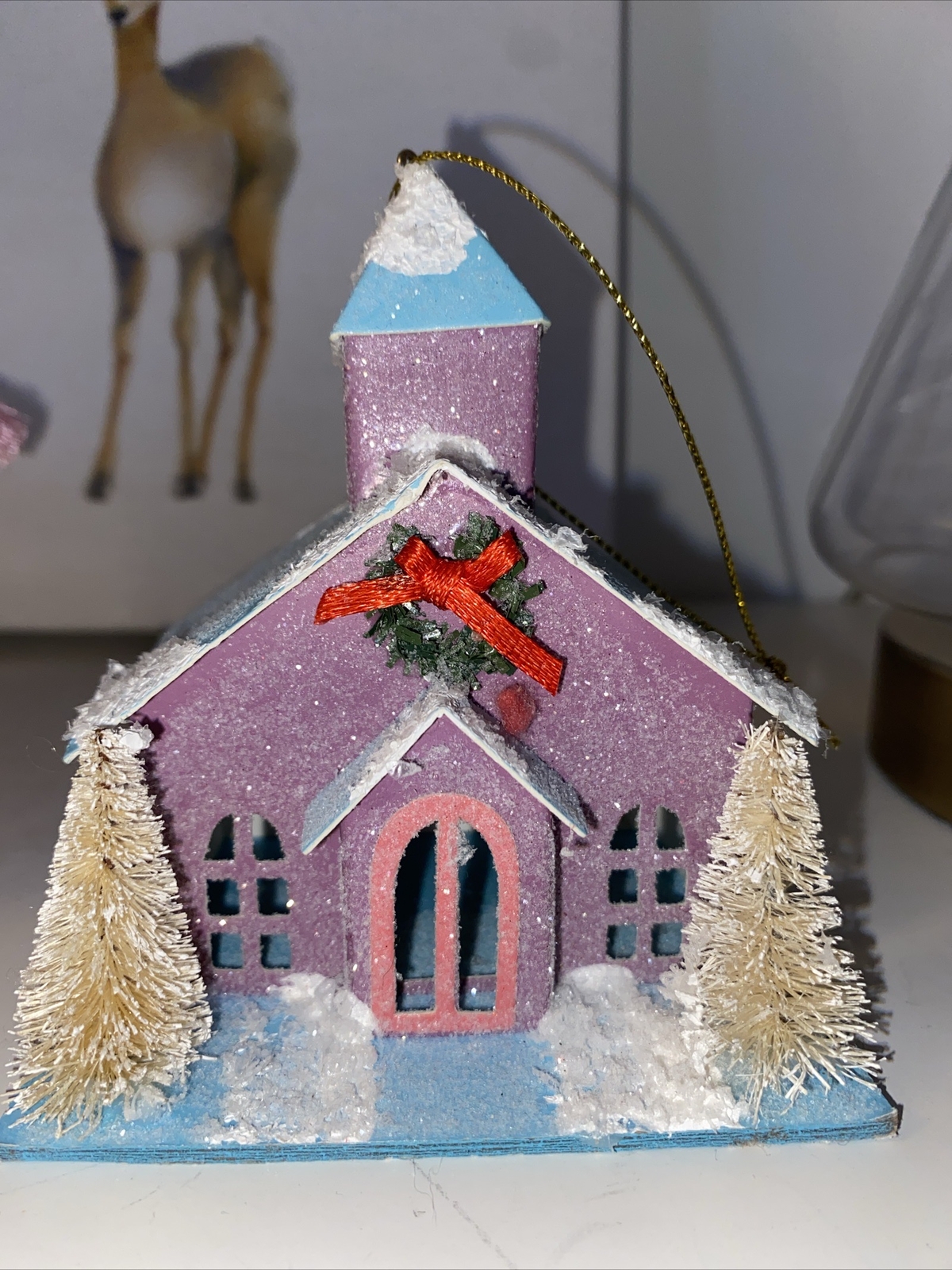 Blue Putz Style House Church Ornament Wondershop Target Cardboard Bottle Trees