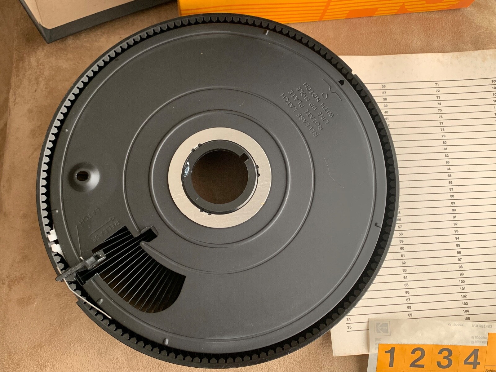 Black Kodak 140 Slide Tray Carousel Projector in the Original Box with papers