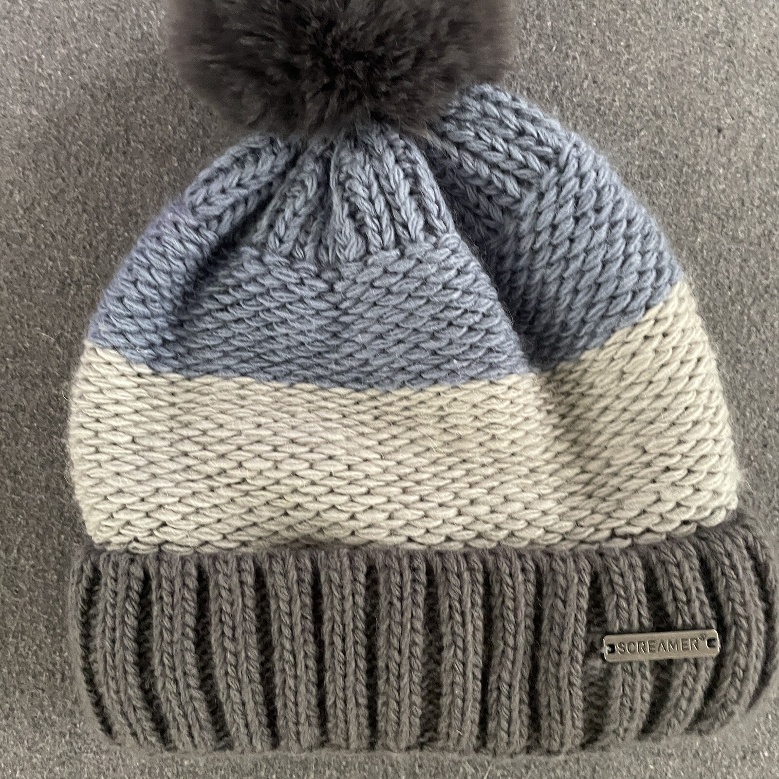 Screamer Beanie Pom Pom Knit Hat Blue Gray Vienna Cuffed Ski Plush Lined Snow