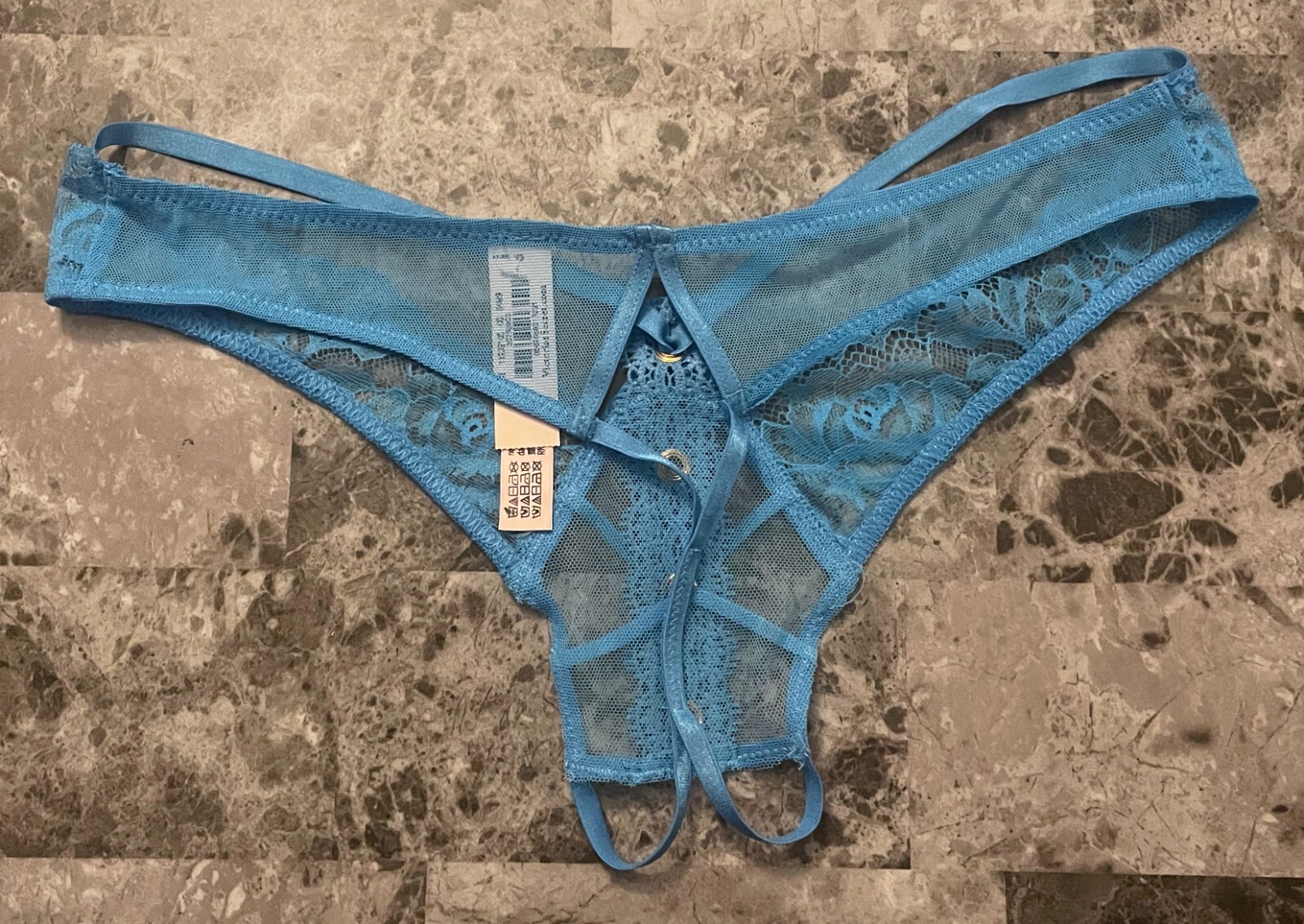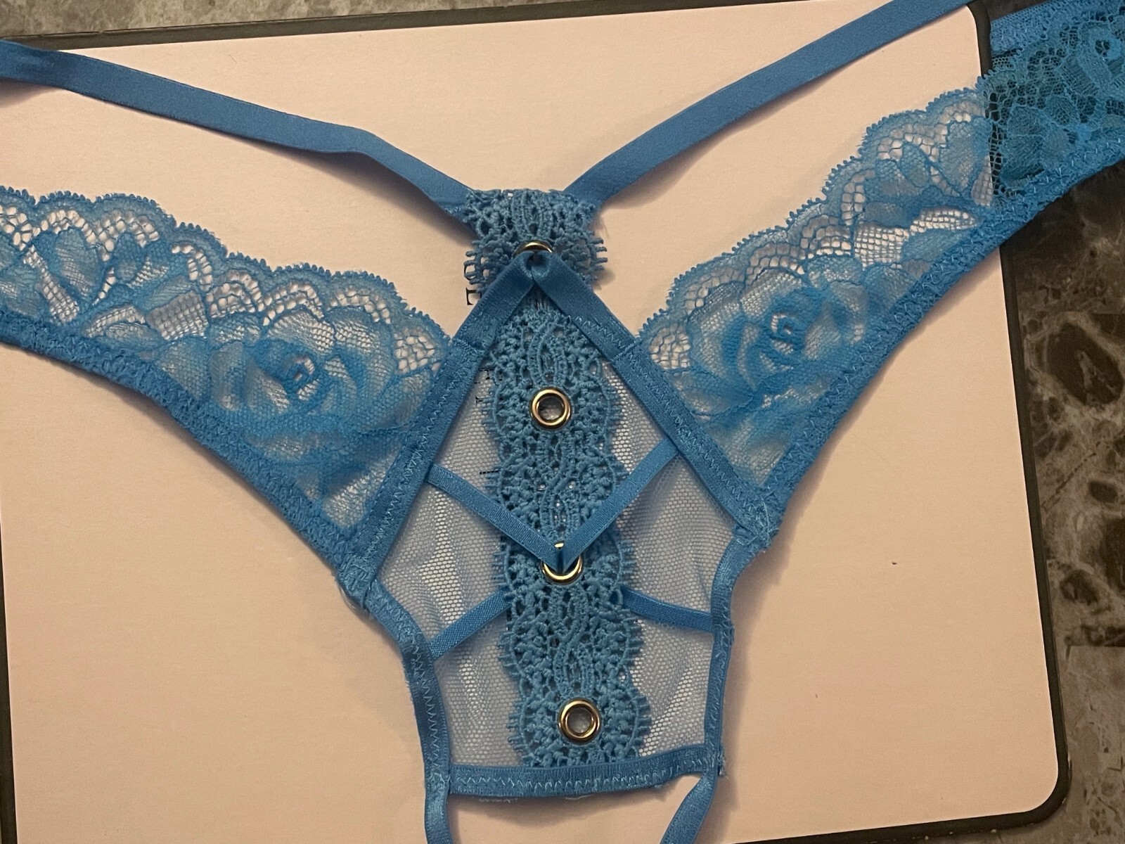 NWT VICTORIA'S SECRET BLUE LACE MESH STRAPPY GOLD RING CROTCHLESS THONG PANTIES