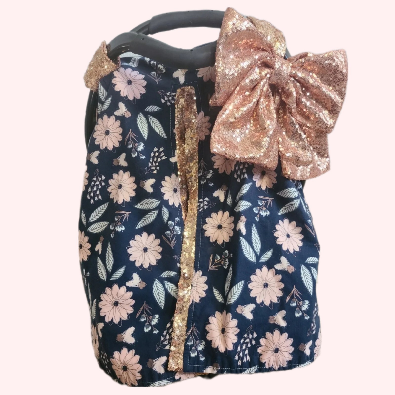 Infant Car Seat Cover Rose Gold Sequin Blue Pink Floral Remove Bow Elastic Back