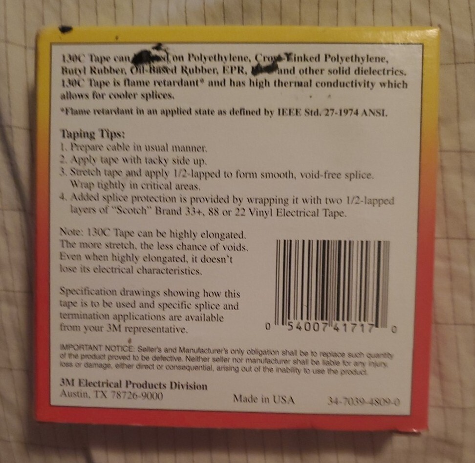 3M 130C Scotch Linerless Rubber Splicing Tape: 3/4 in x 30 ft. Black Free Shipng