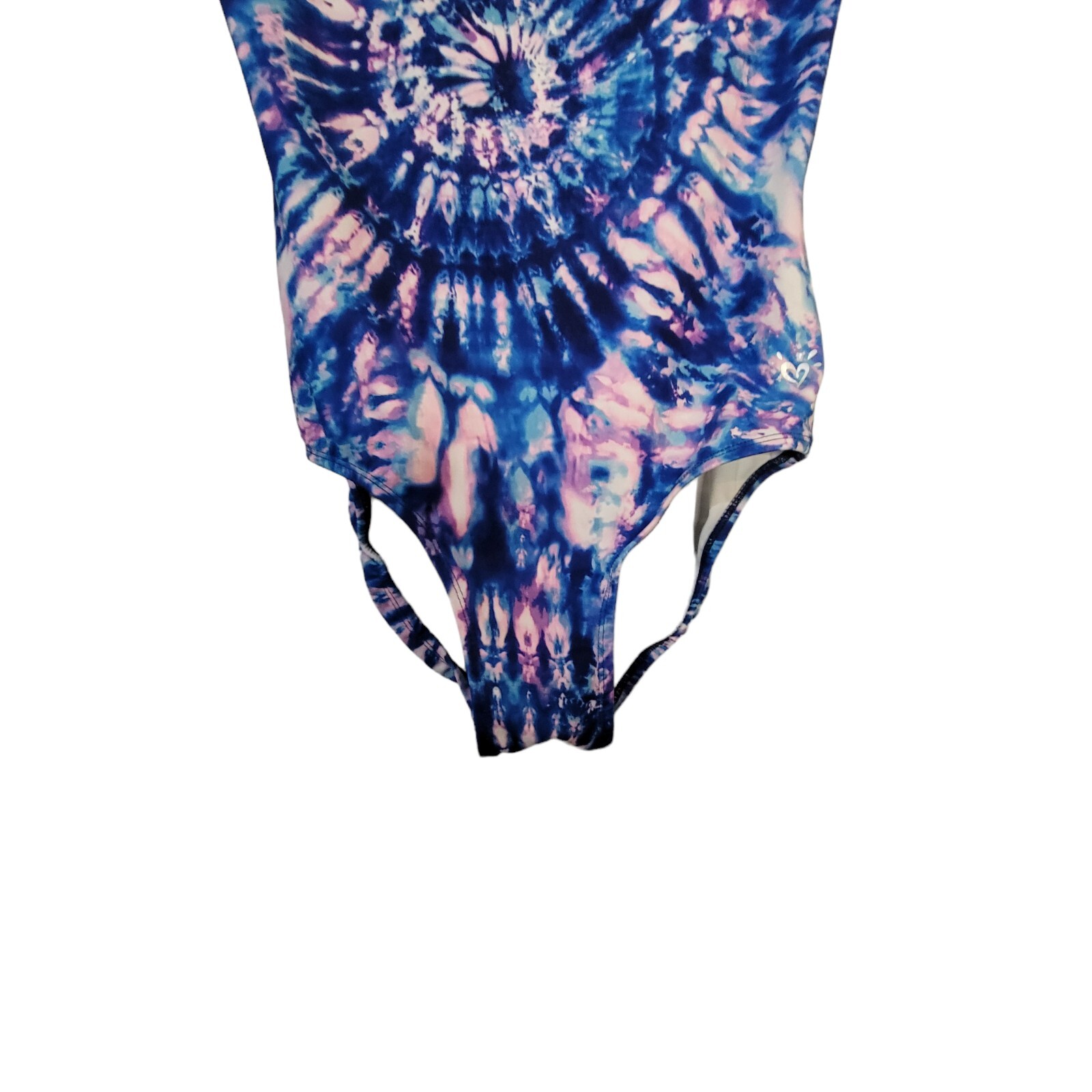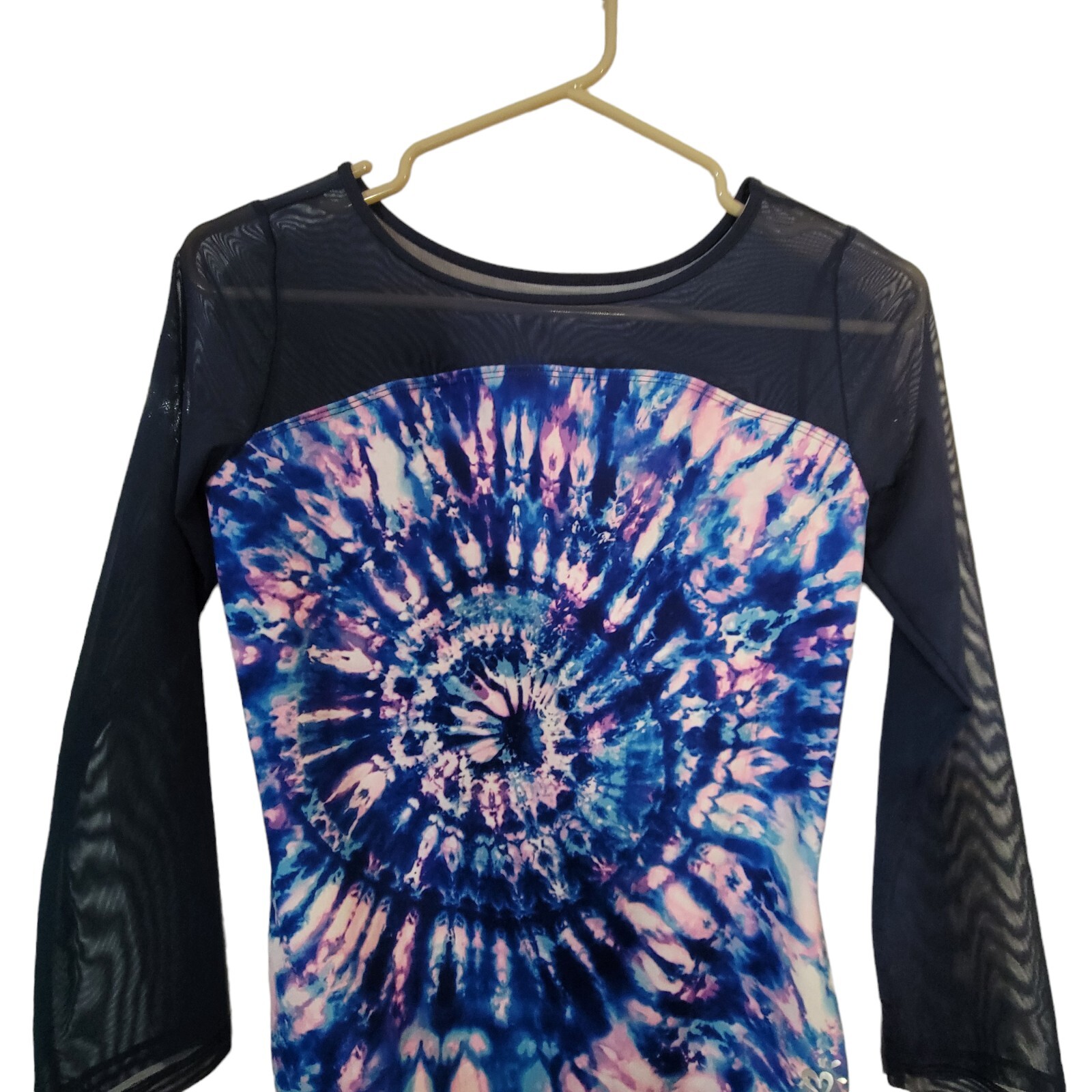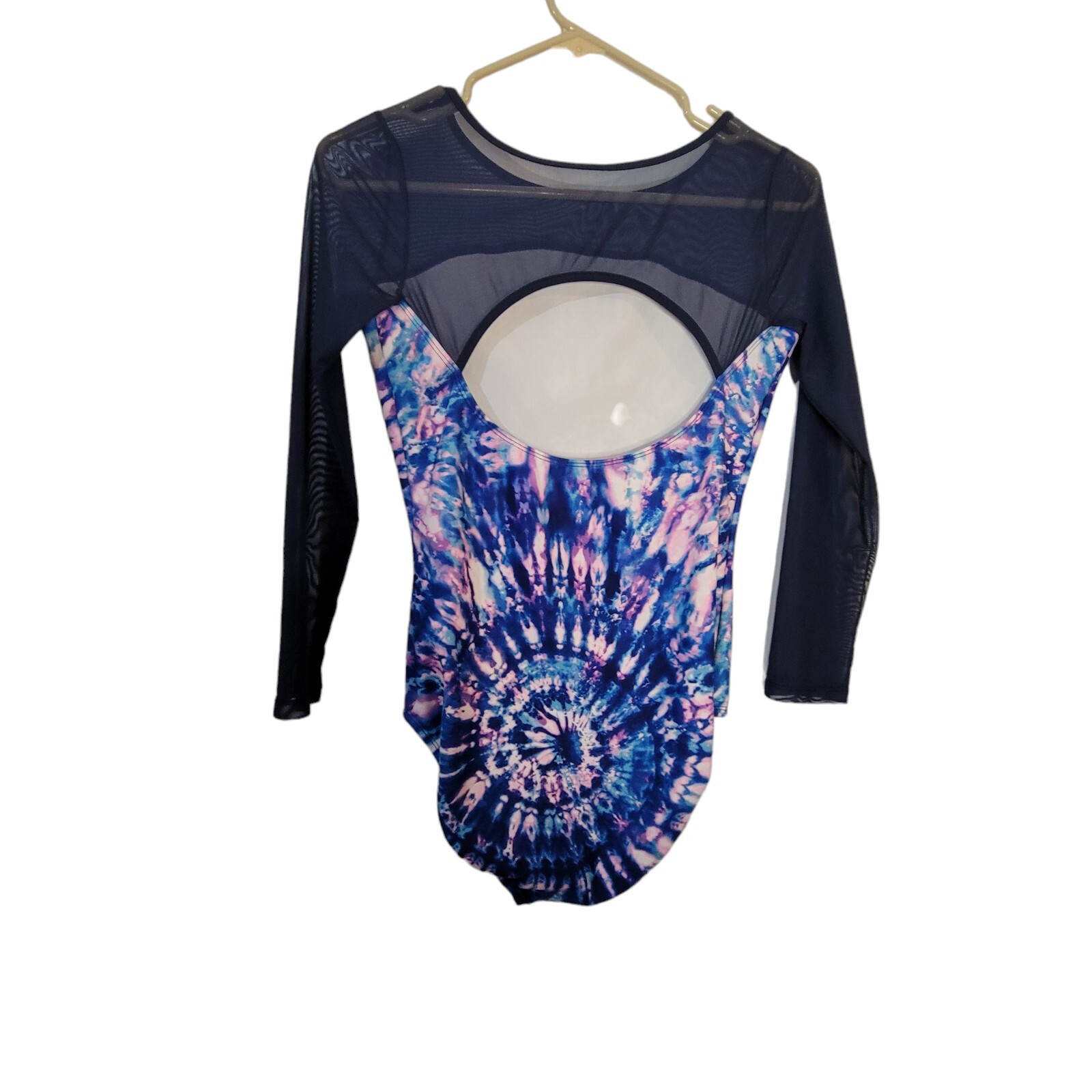 Justice sport leotard blue with tie dye design and mesh long sleeves size 18