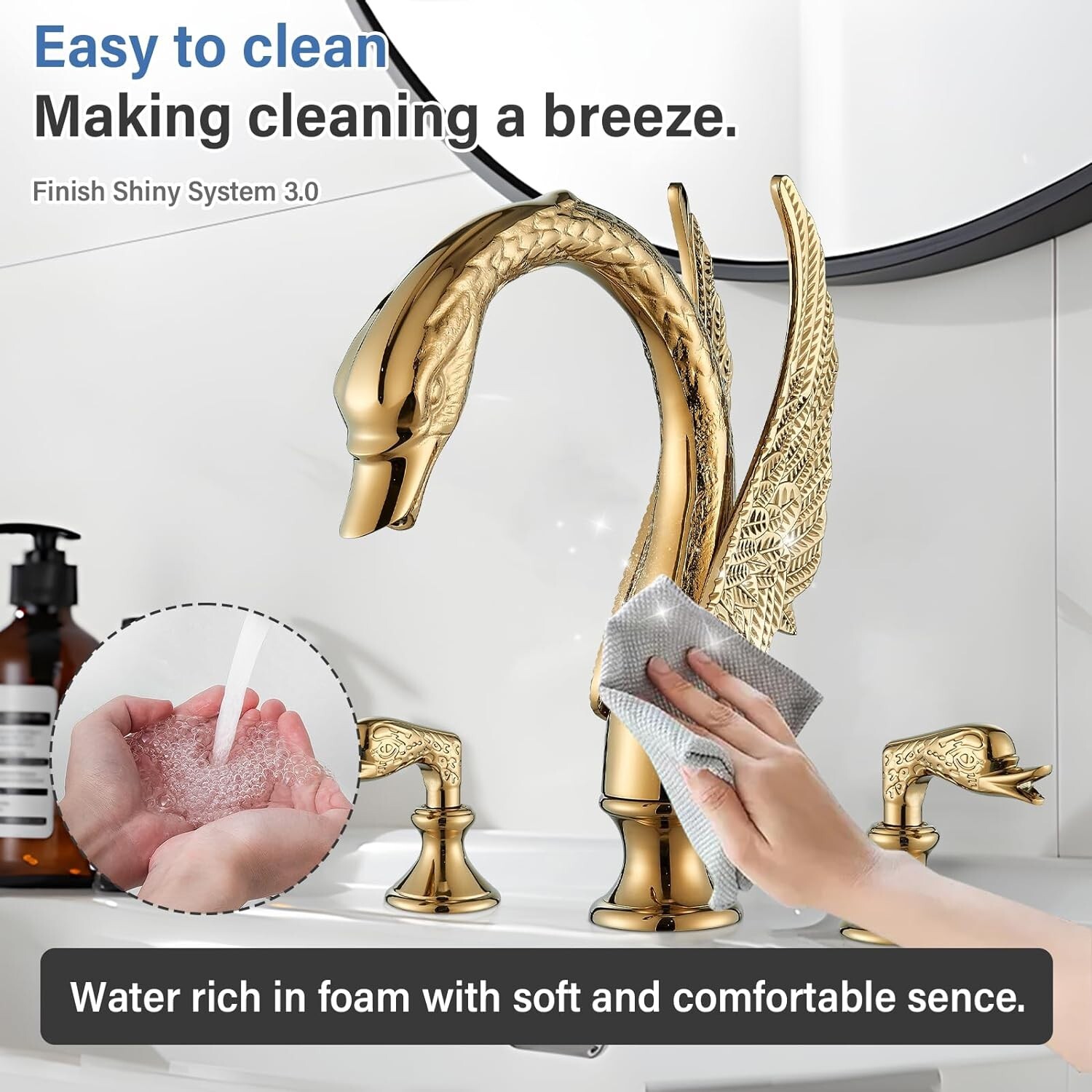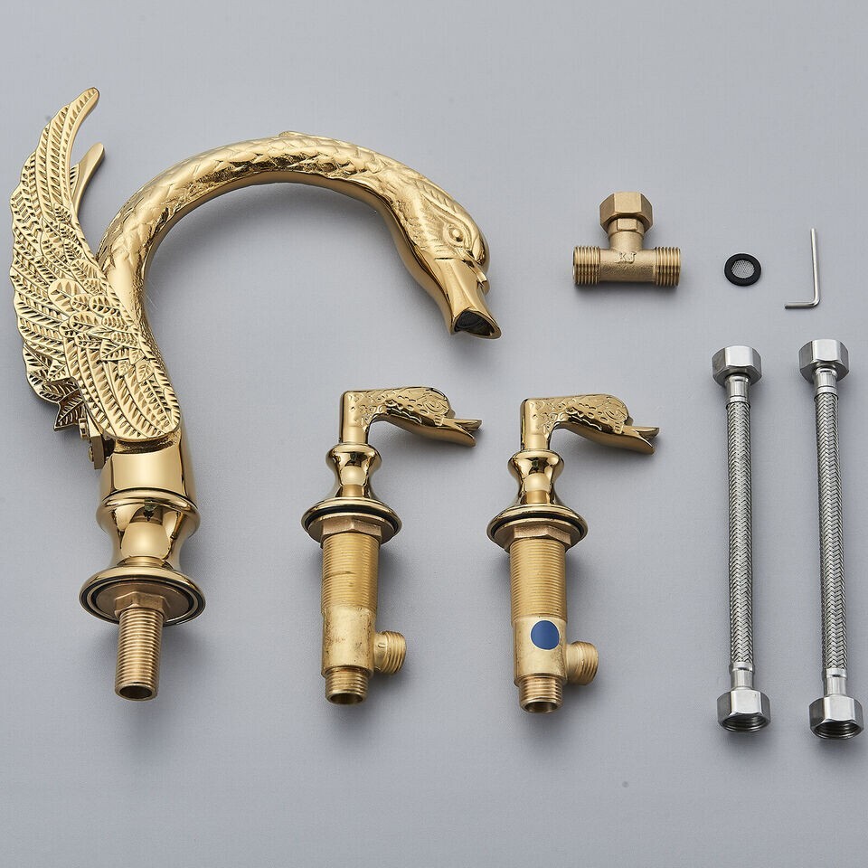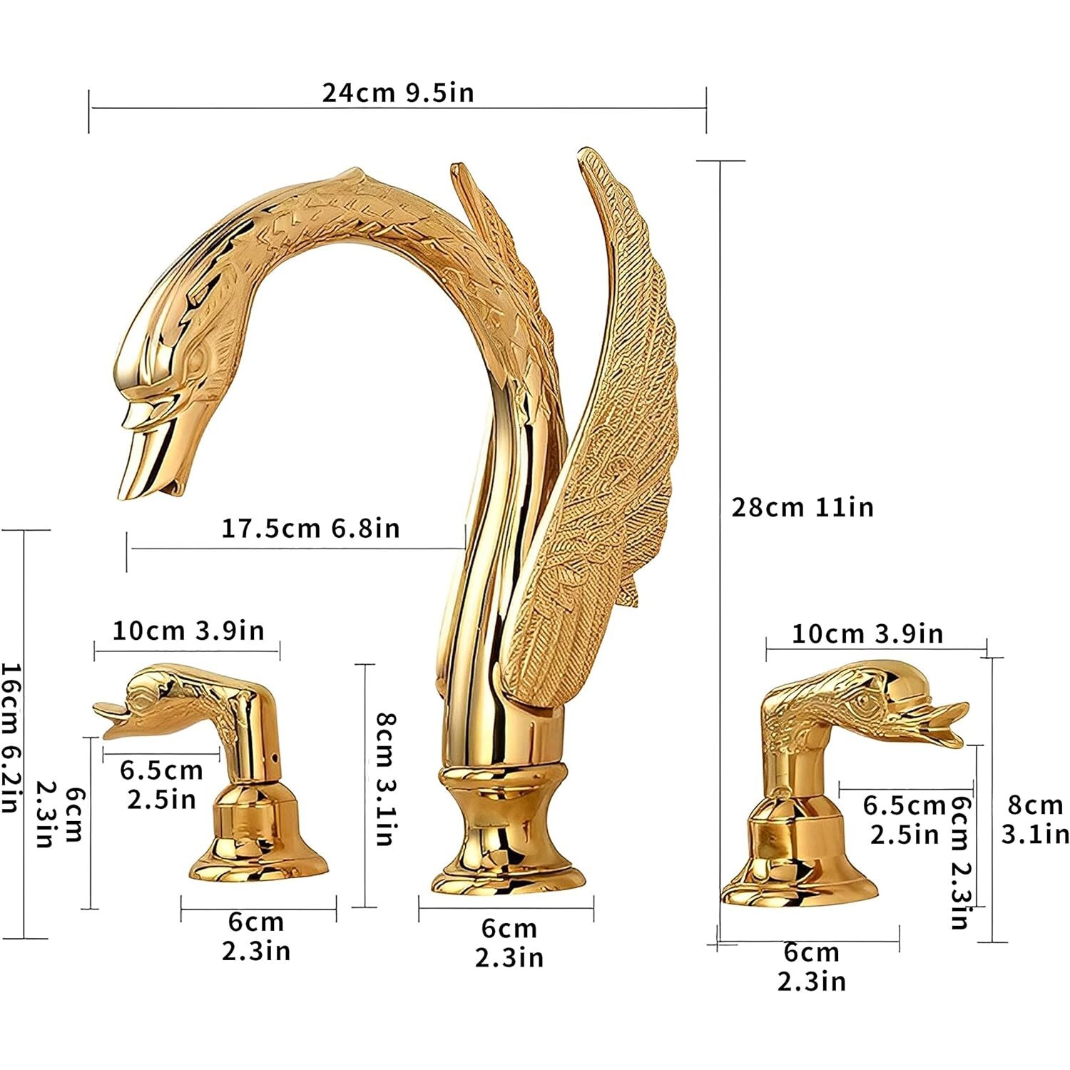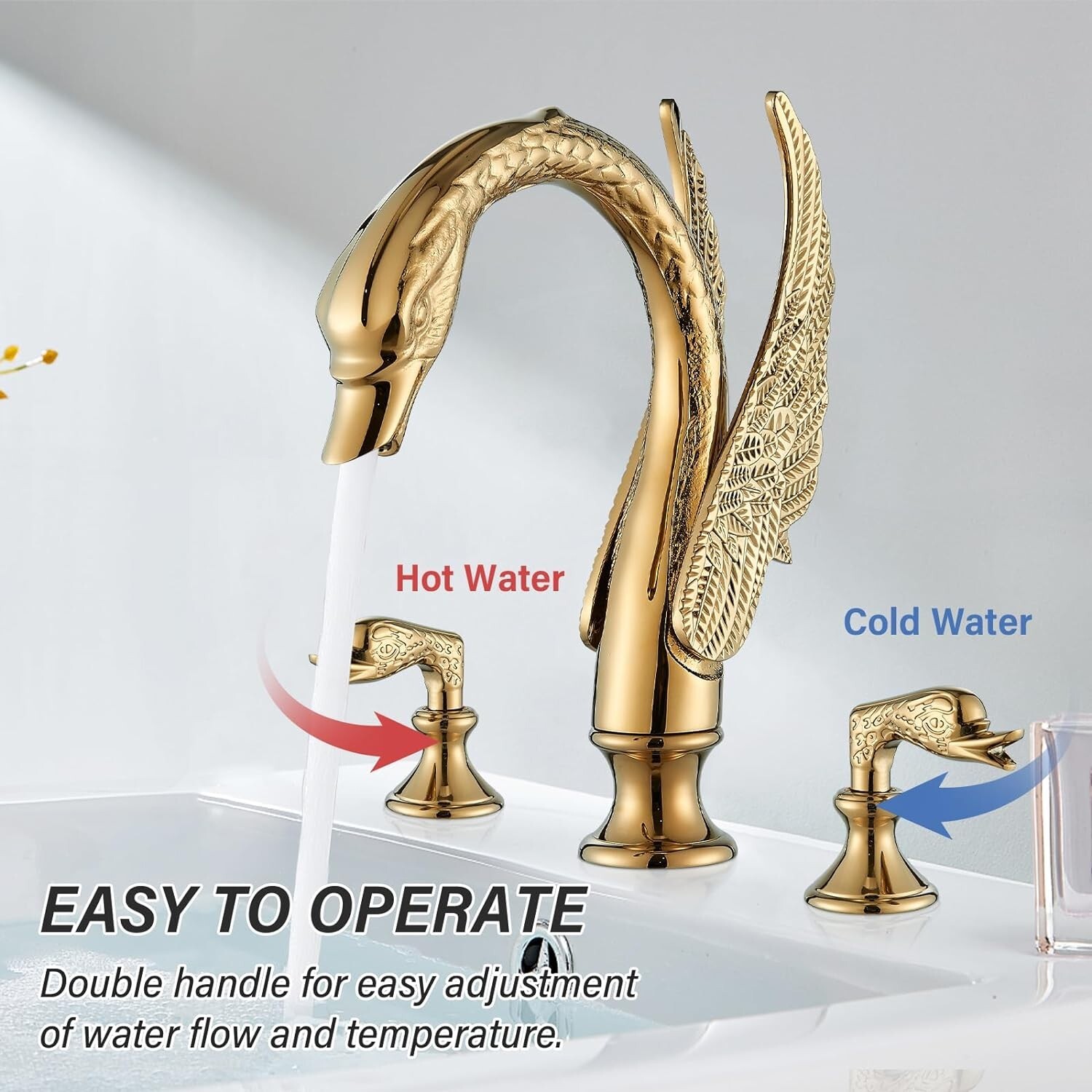 Gold Bathroom Sink Faucet Widespread 3-Hole 2 Swan Handles Deck Mount Mixer Tap