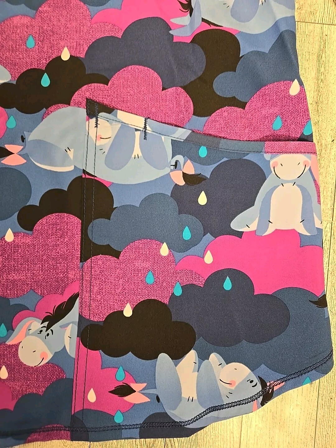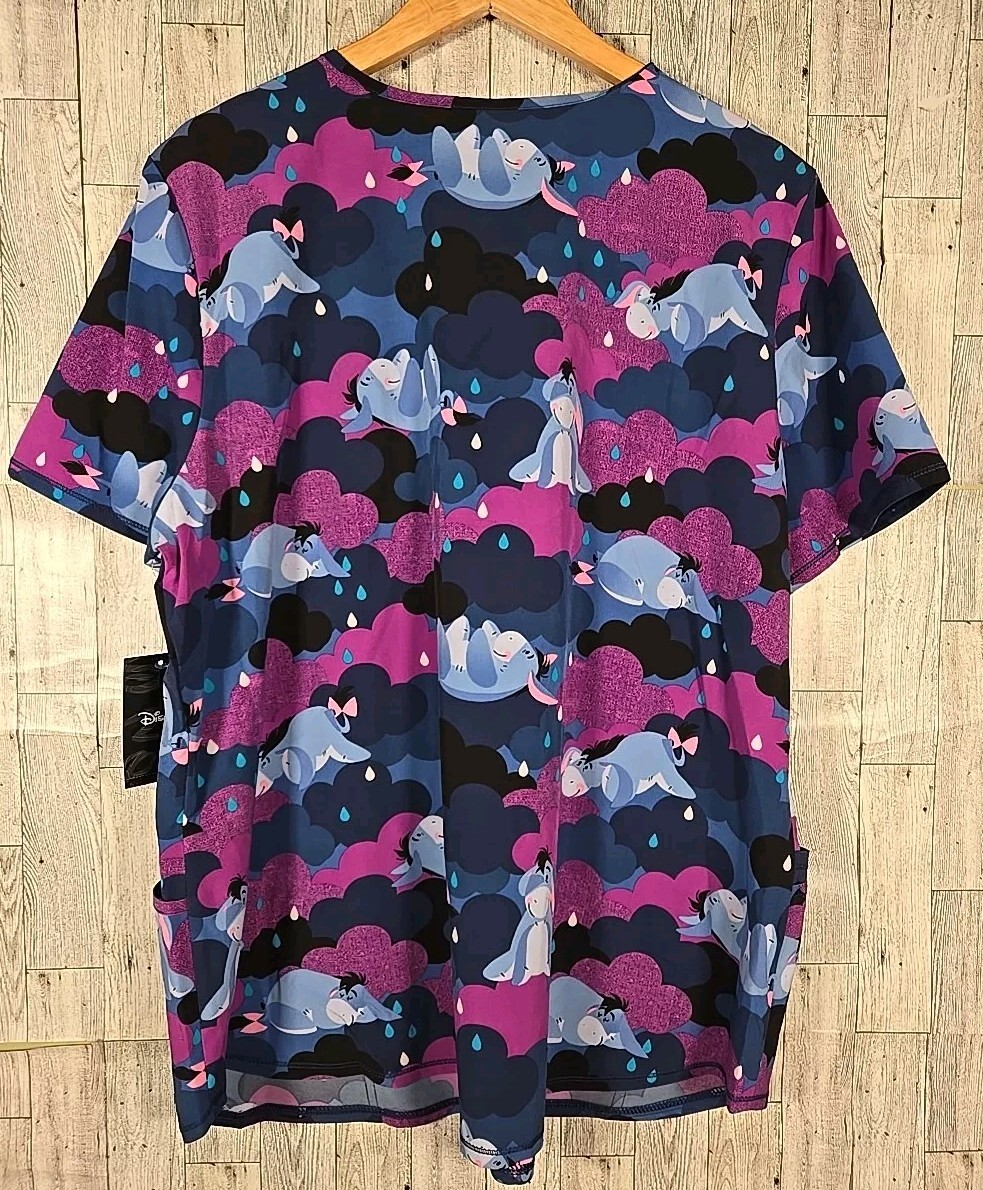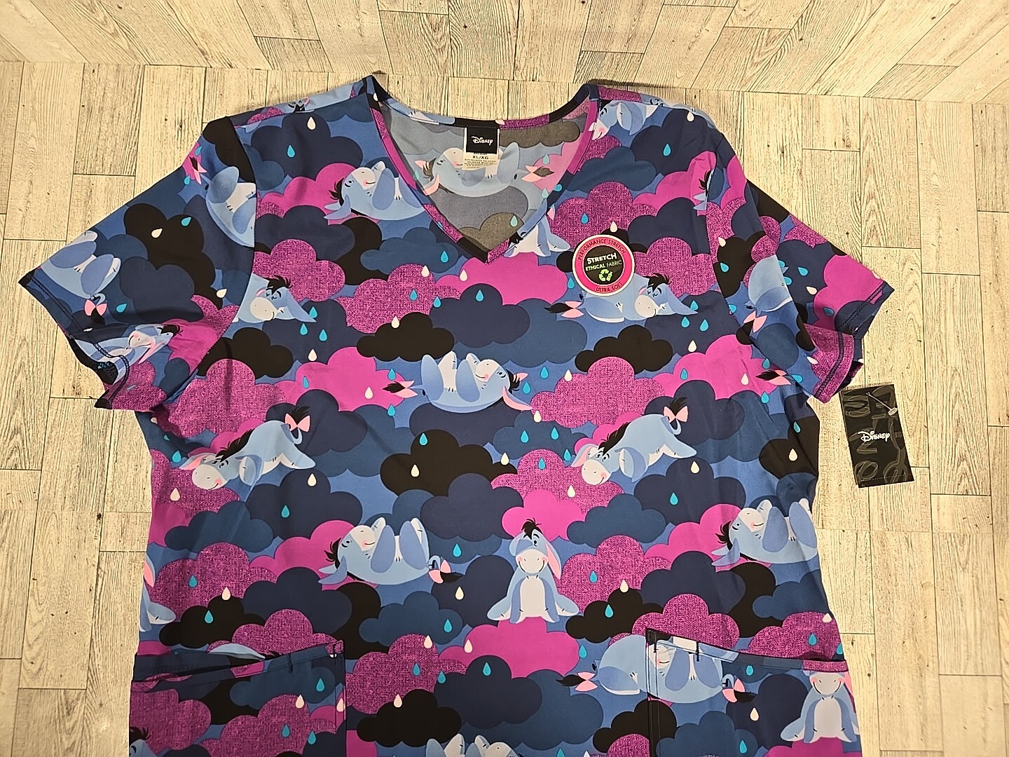 Eeyore Disney Scrub Shirt LARGE Neck Stretch Top Rain Purple Blue NEW