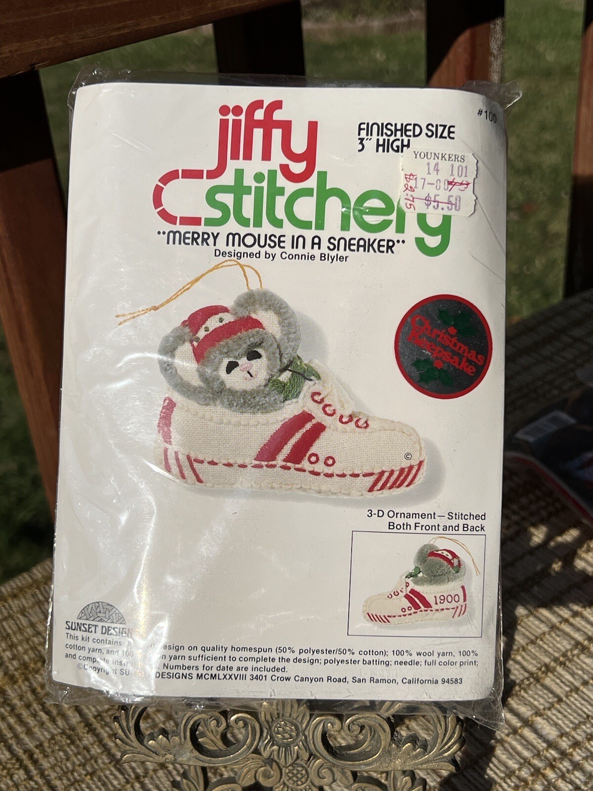 Vintage Jiffy Stitchery Merry Mouse In A Sneaker Ornament Kit NIP